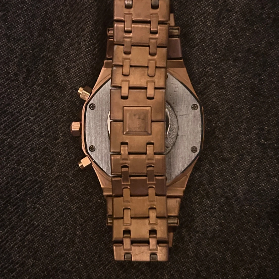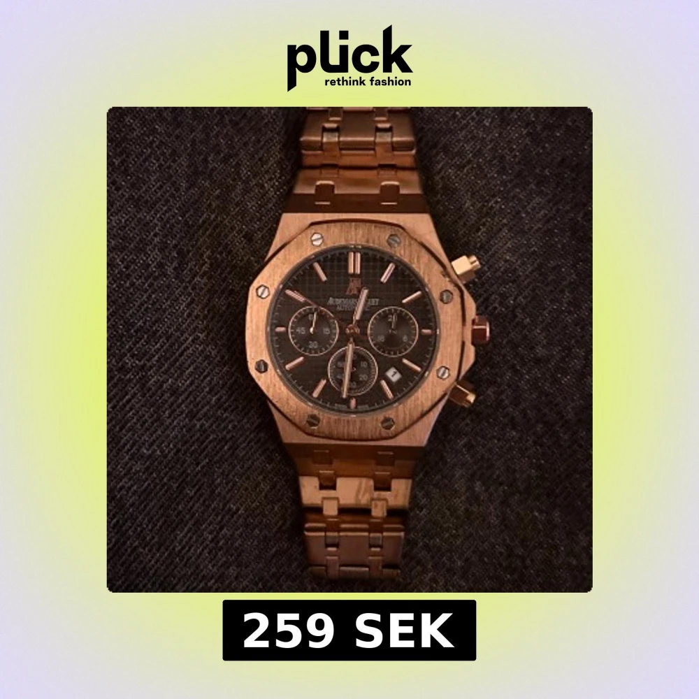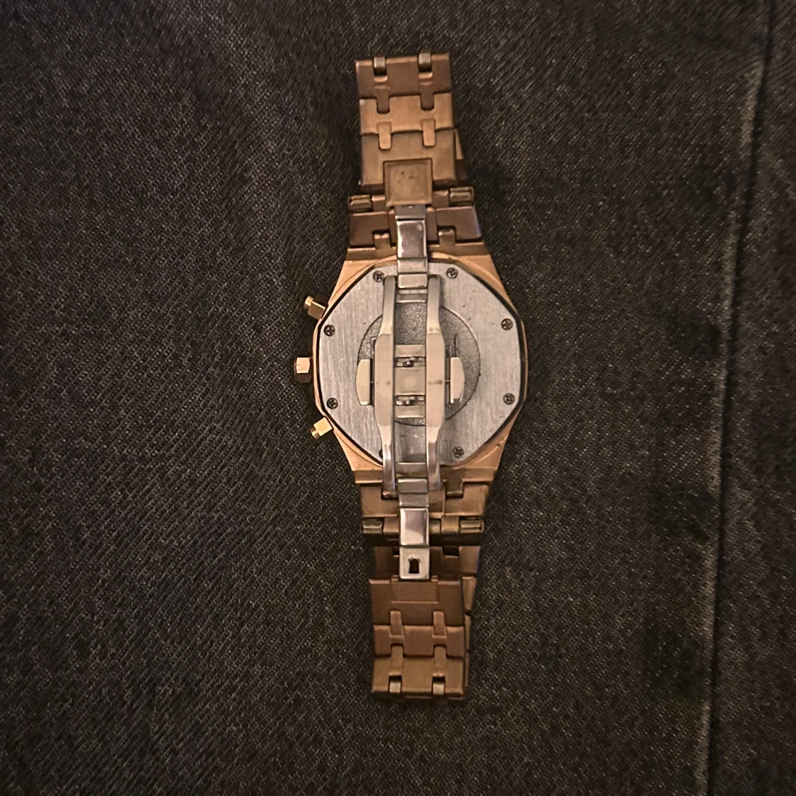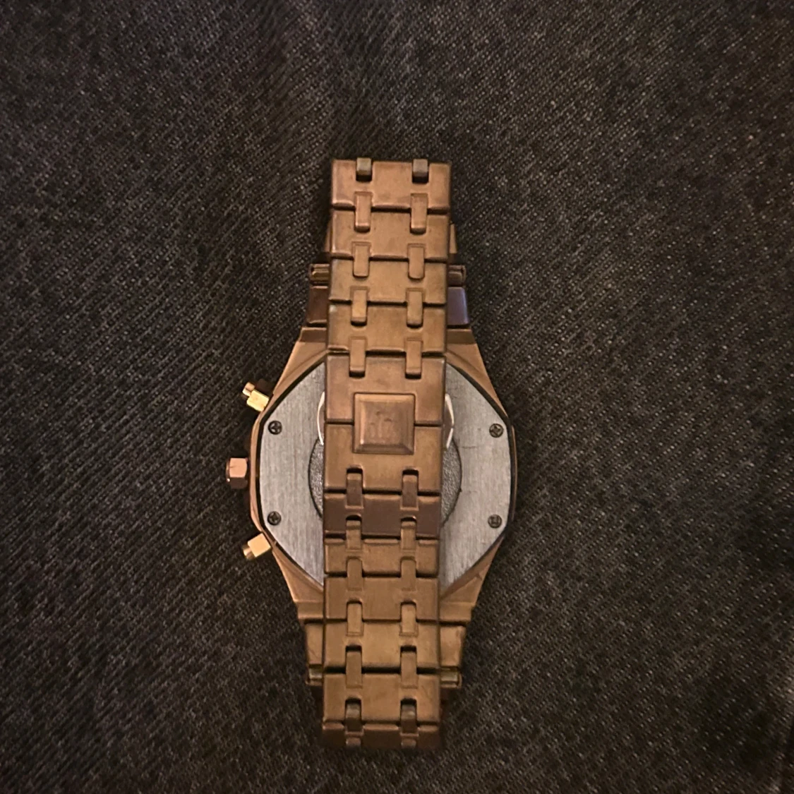 Exklusiv herrklocka från Audemars Piguet Royal Oak med guldigt armband och boett. Klockan har svart urtavla med kronograf och datumvisning. Ikonisk åttakantig form och detaljerad länkdesign.
