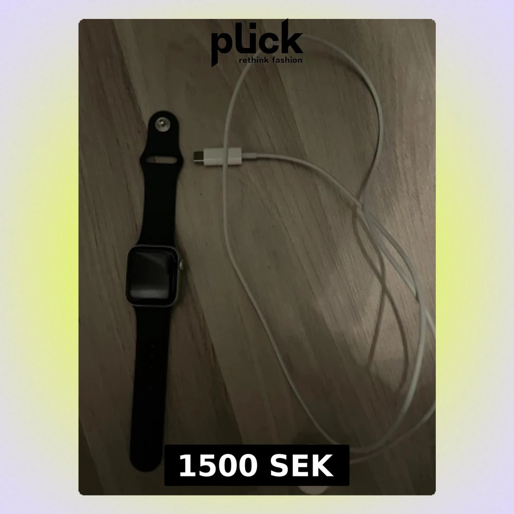 Säljer en stilren svart Apple Watch med fyrkantig display och matchande svart silikonarmband. Klockan har en modern look och kommer med original laddkabel. Perfekt för dig som vill ha koll på mobilen direkt på handleden.