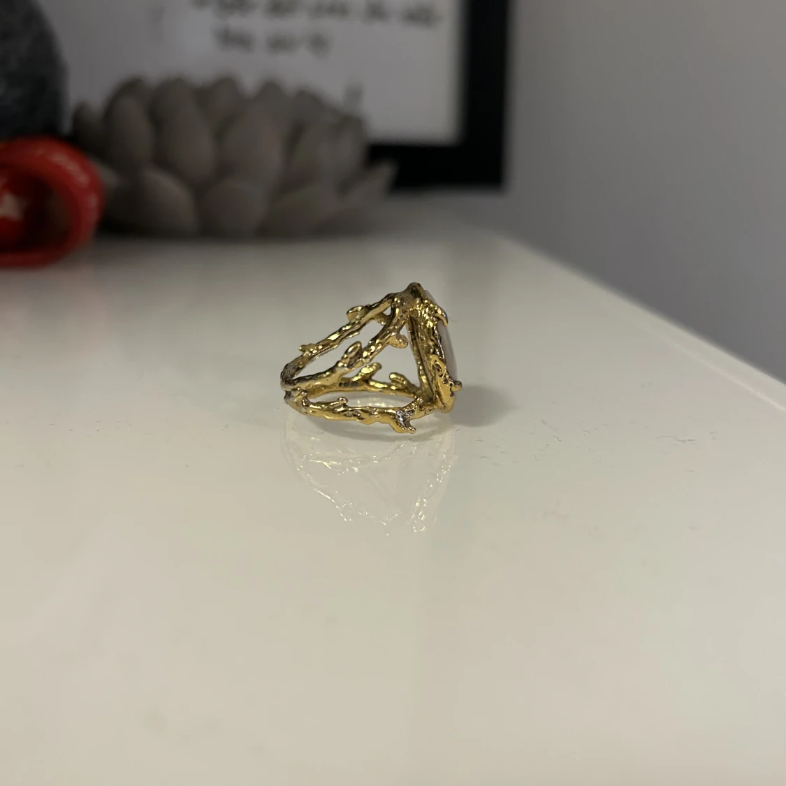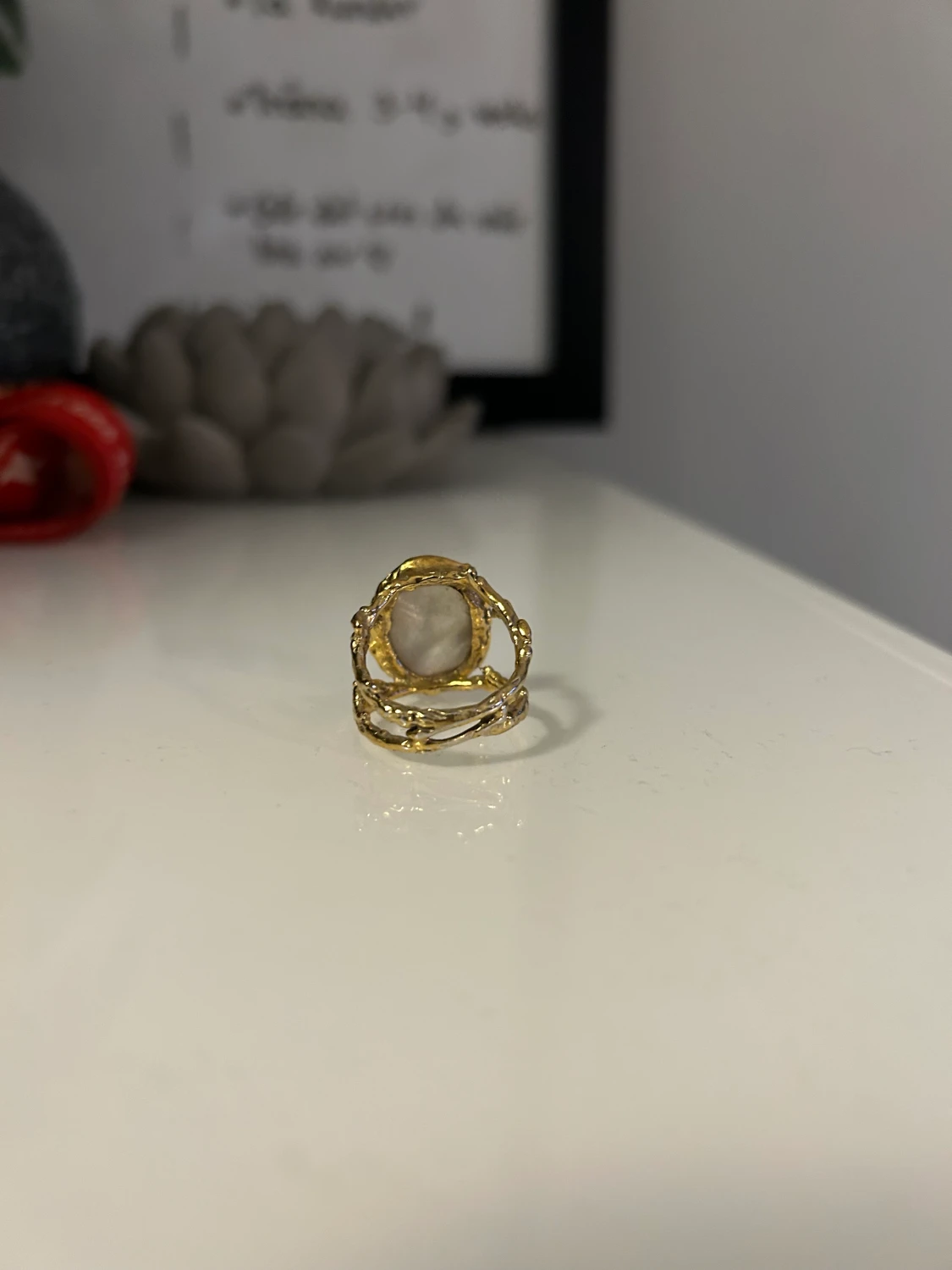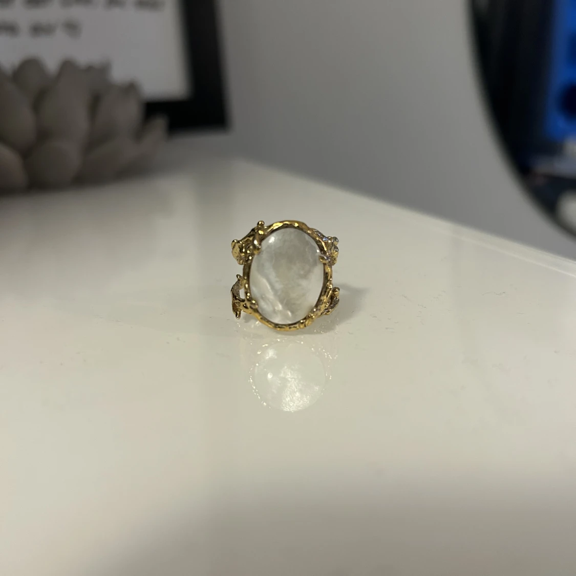 Ringen är från Maria Nilsdotter. Guldplätterad med Pärlemor. Storlek 17. Produkten är unik då den inte finns att köpa i butik längre.