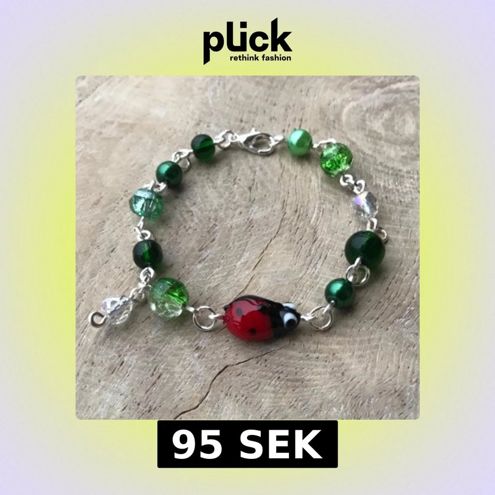 Vackert silver armband av gröna glaspärlor och en nyckelpiga. 🐞🌿🍄
