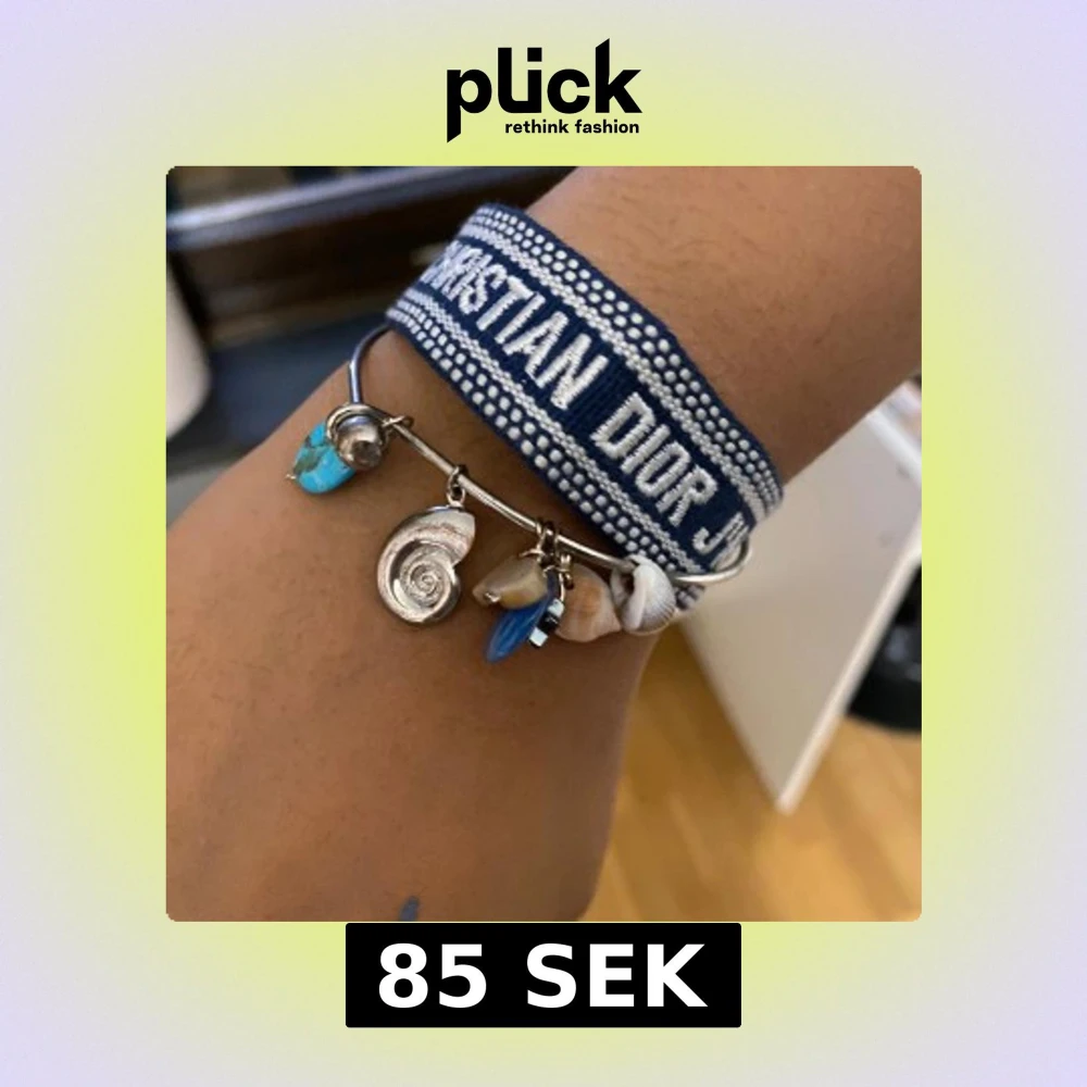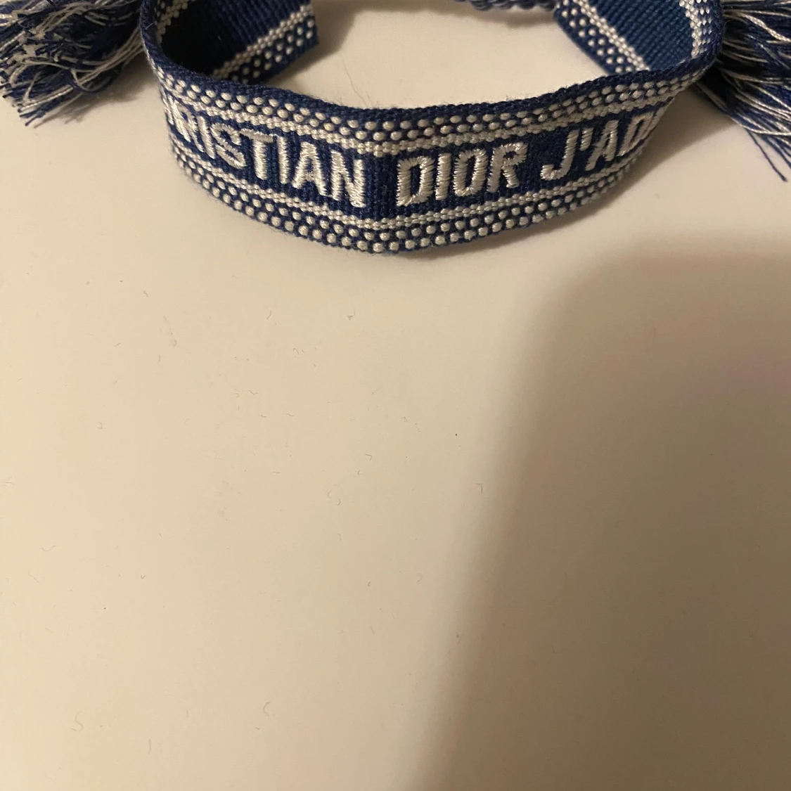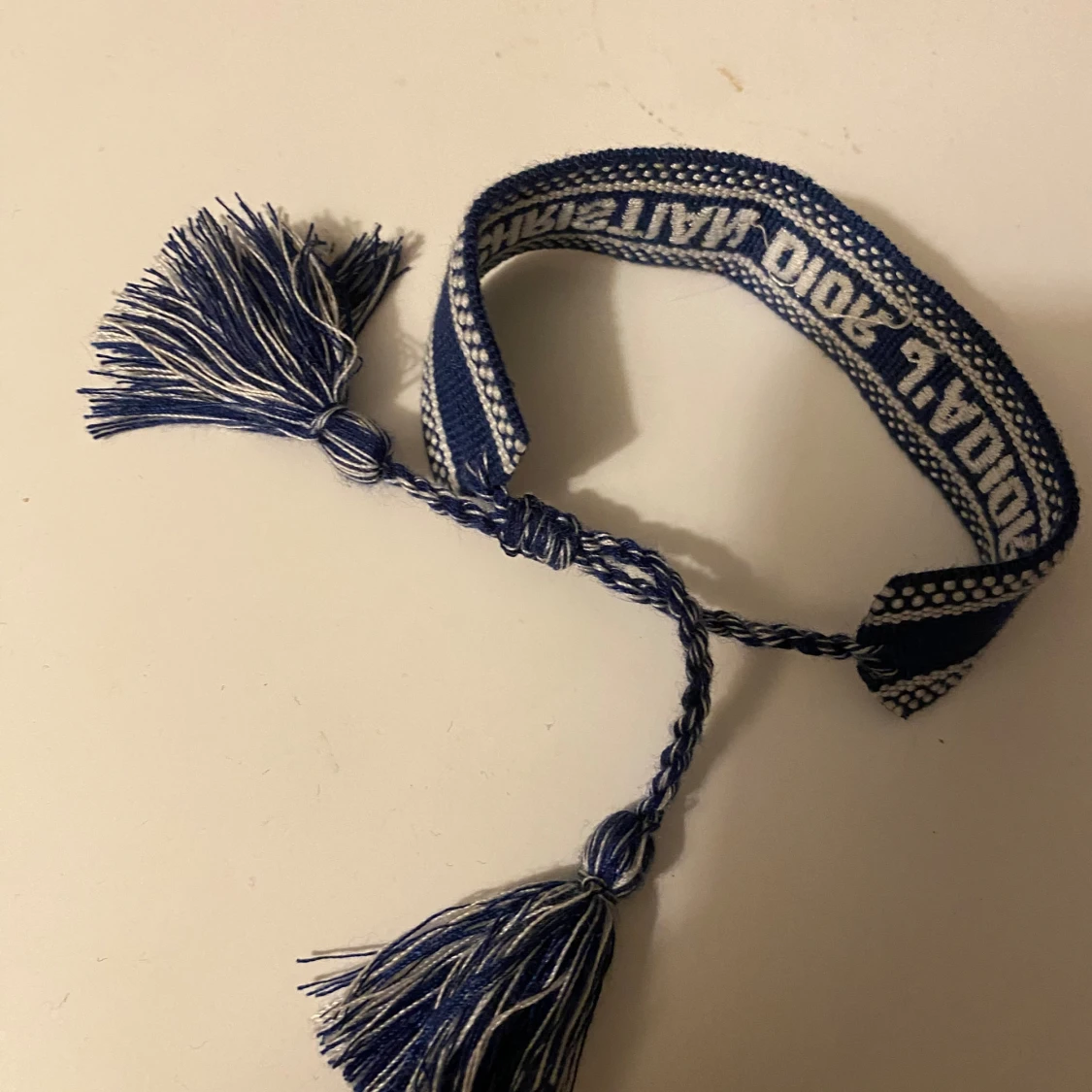 Snyggt blått armband från Christian Dior med texten 'J'adior' broderad i vitt. Armbandet är gjort i bomull och har dekorativa tofsar i ändarna. Perfekt accessoar för att lyfta din outfit med en lyxig touch.