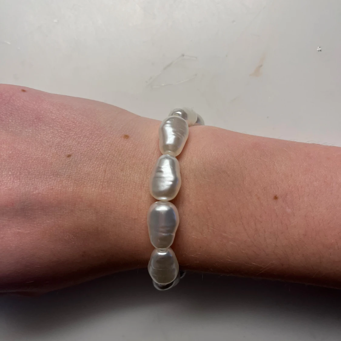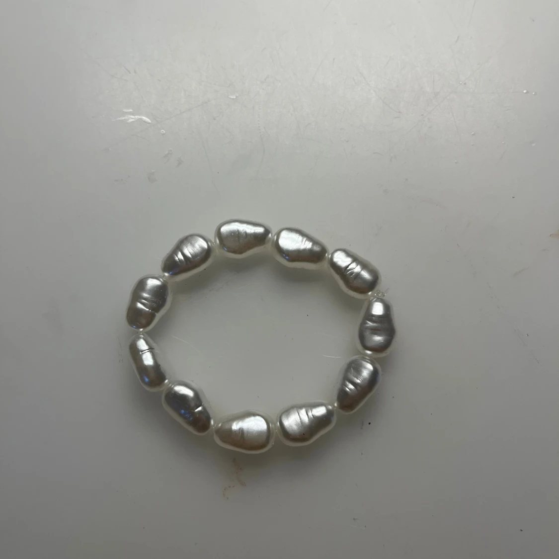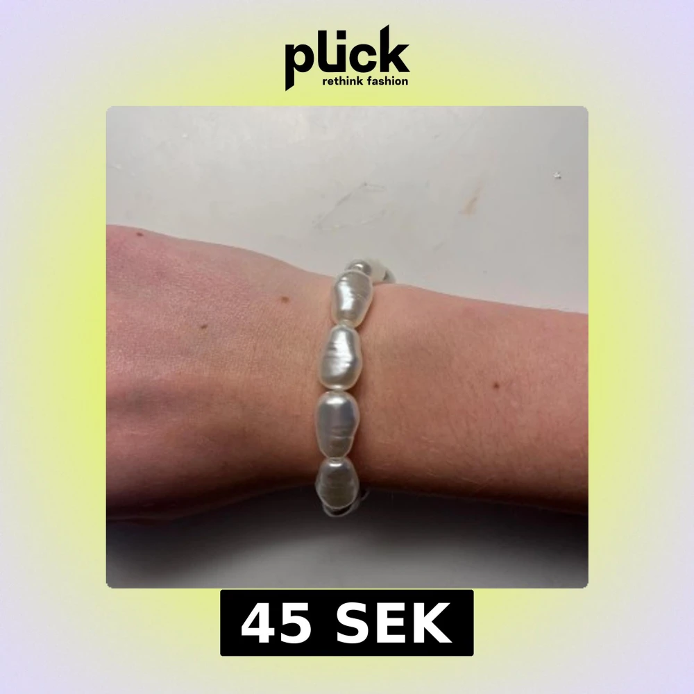 Snyggt armband med stora, oregelbundna vita pärlor som ger en cool och unik look. Pärlorna har en skimrande yta och är trädda på elastisk tråd för enkel användning. Perfekt för dig som gillar statement-smycken och vill sticka ut lite extra.