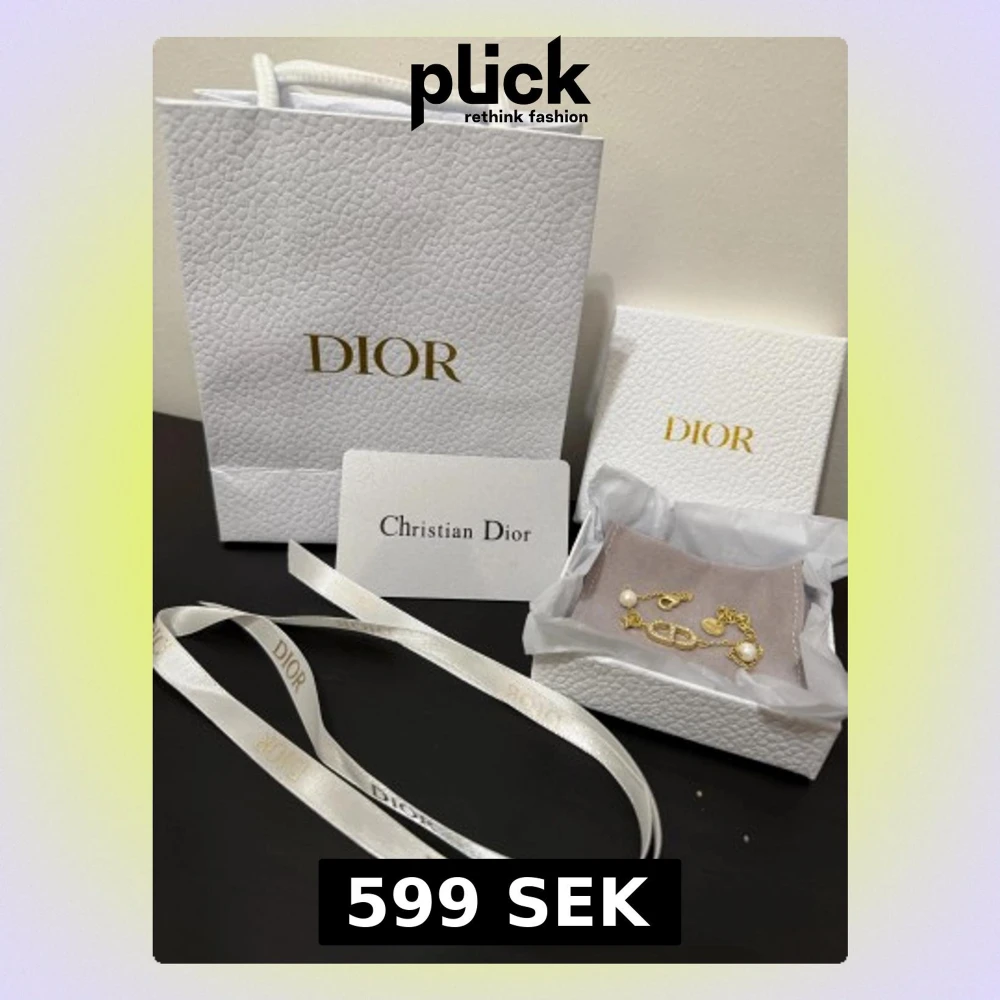 Exklusivt armband från Dior i guldtonad metall med glittrande CD-logo, två vita pärlor och en liten stjärndetalj. Kedjan har en rund Dior-tag och smidig karbinlås. Kommer med original ask, påse och band. Perfekt för dig som gillar lyxiga detaljer.
