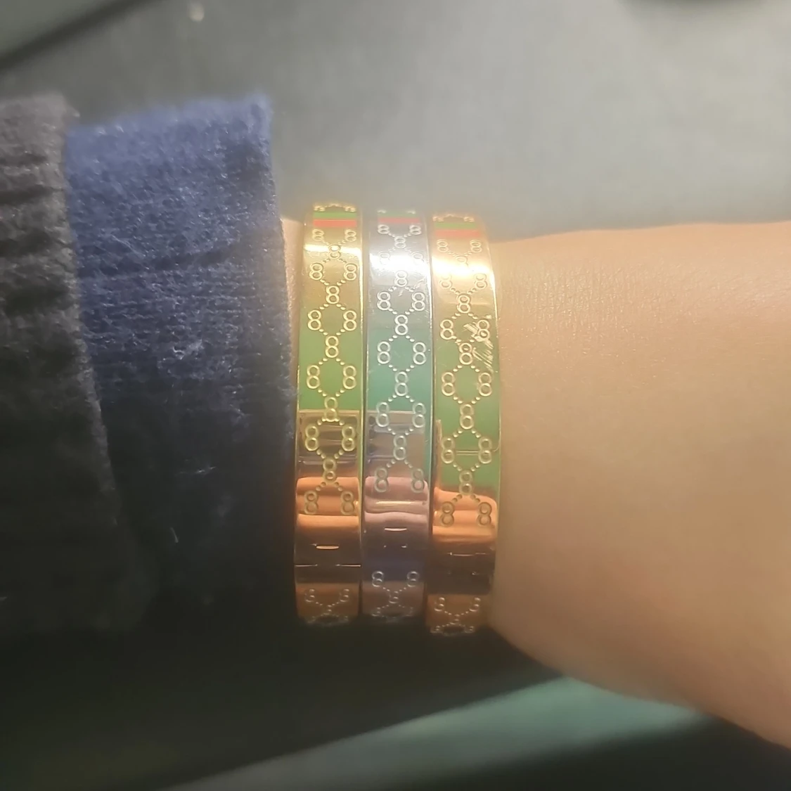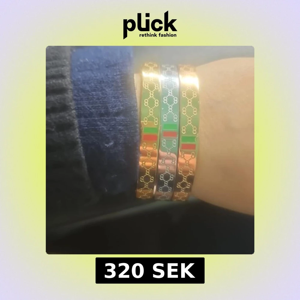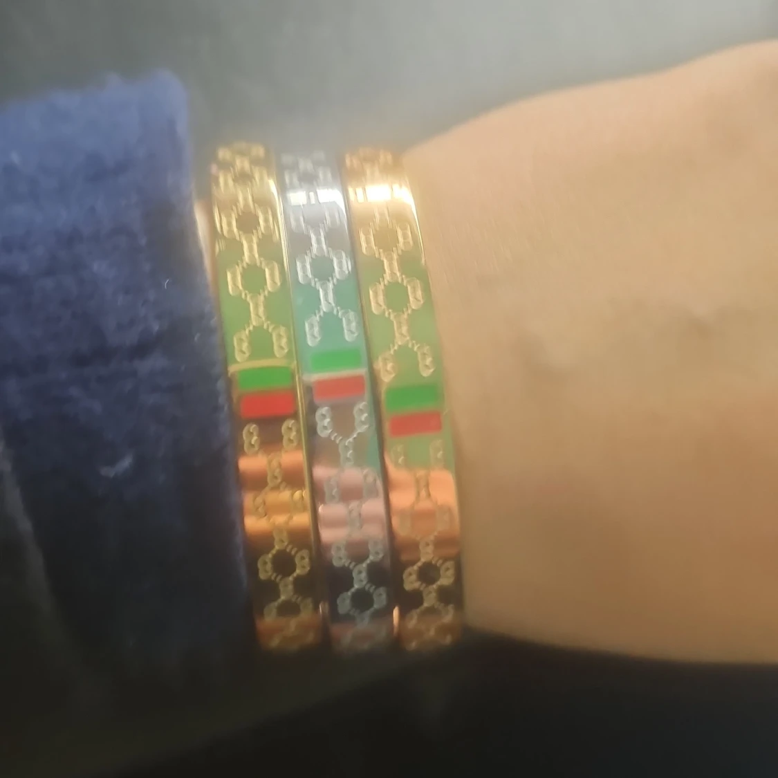 Tre stilrena armband i metall med mönster. Två armband är guldfärgade och ett är silverfärgat, alla med gröna och röda detaljer. Perfekt accessoar för dig som vill sticka ut med lyxig känsla och trendig design.