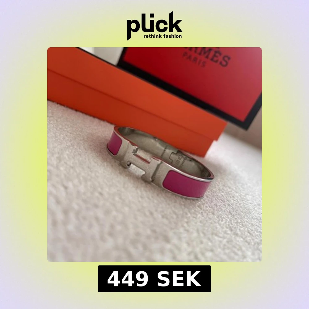 Säljer ett ikoniskt armband i silverfärgad metall med rosa emaljdetaljer. Armbandet har den klassiska formade låset och en stilren, modern design. Perfekt för dig som vill ha en färgklick på handleden och älskar lyxiga accessoarer.