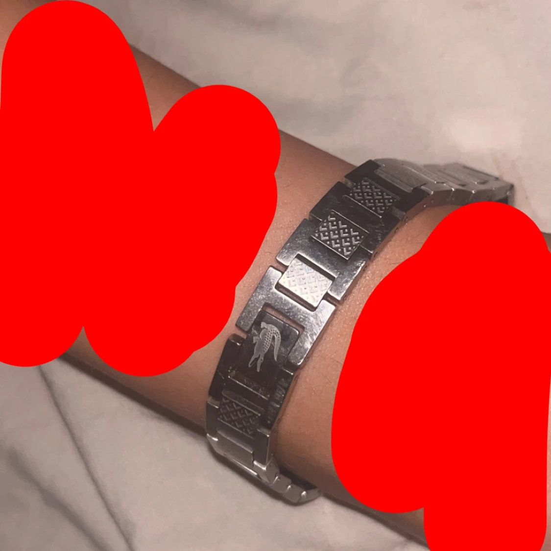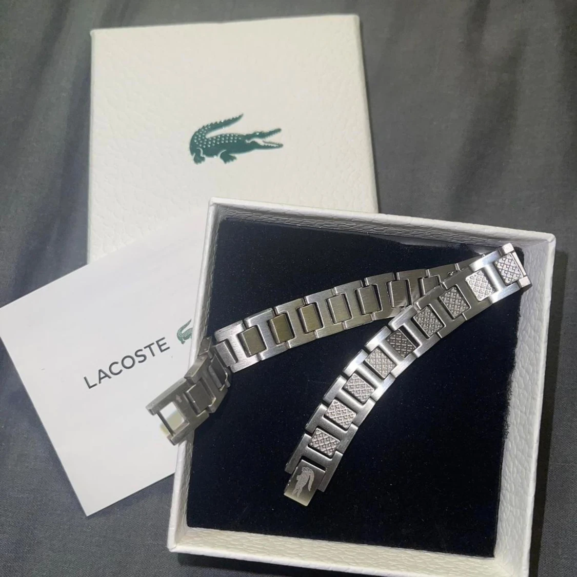 Stilrent armband i silverfärgad metall från Lacoste med klassisk krokodil-logga på spännet. Länkarna har snygga graverade detaljer, ganska ny men inte använd skulle ges som present men blev inte av. Perfekt att ge till sin kille/pappa. Priset kan diskuteras❤️