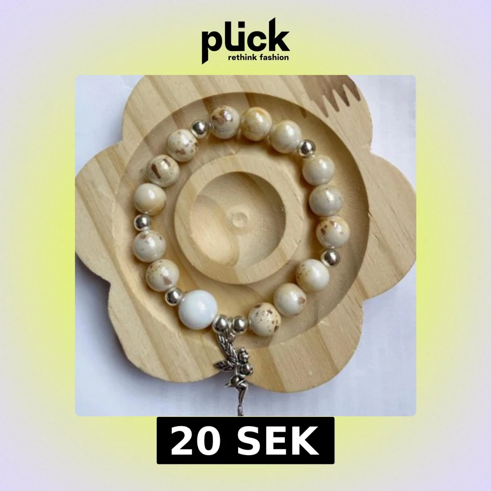 Snyggt armband med runda vita pärlor och silverfärgade kulor. Armbandet har en söt ängelberlock som hänger ner. Perfekt accessoar för att ge din outfit en unik touch.