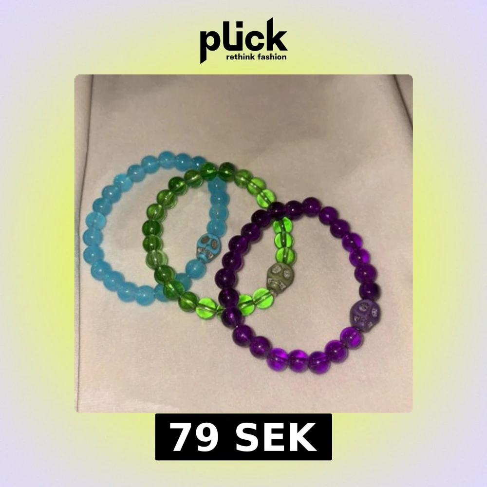 Tre elastiska armband med runda pärlor i blått, grönt och lila. Varje armband har en cool dödskallepärla i matchande färg. Perfekt accessoar för dig som gillar färg och unika detaljer. Säljes tillsammans eller separat.