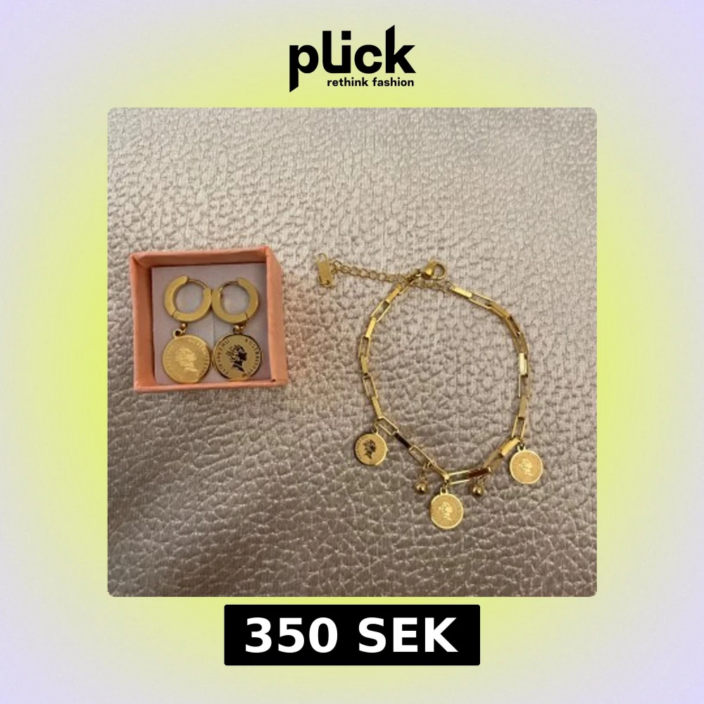 Snyggt set med guldörhängen och matchande armband, båda med hängande myntmotiv och är i rostfrittstål.