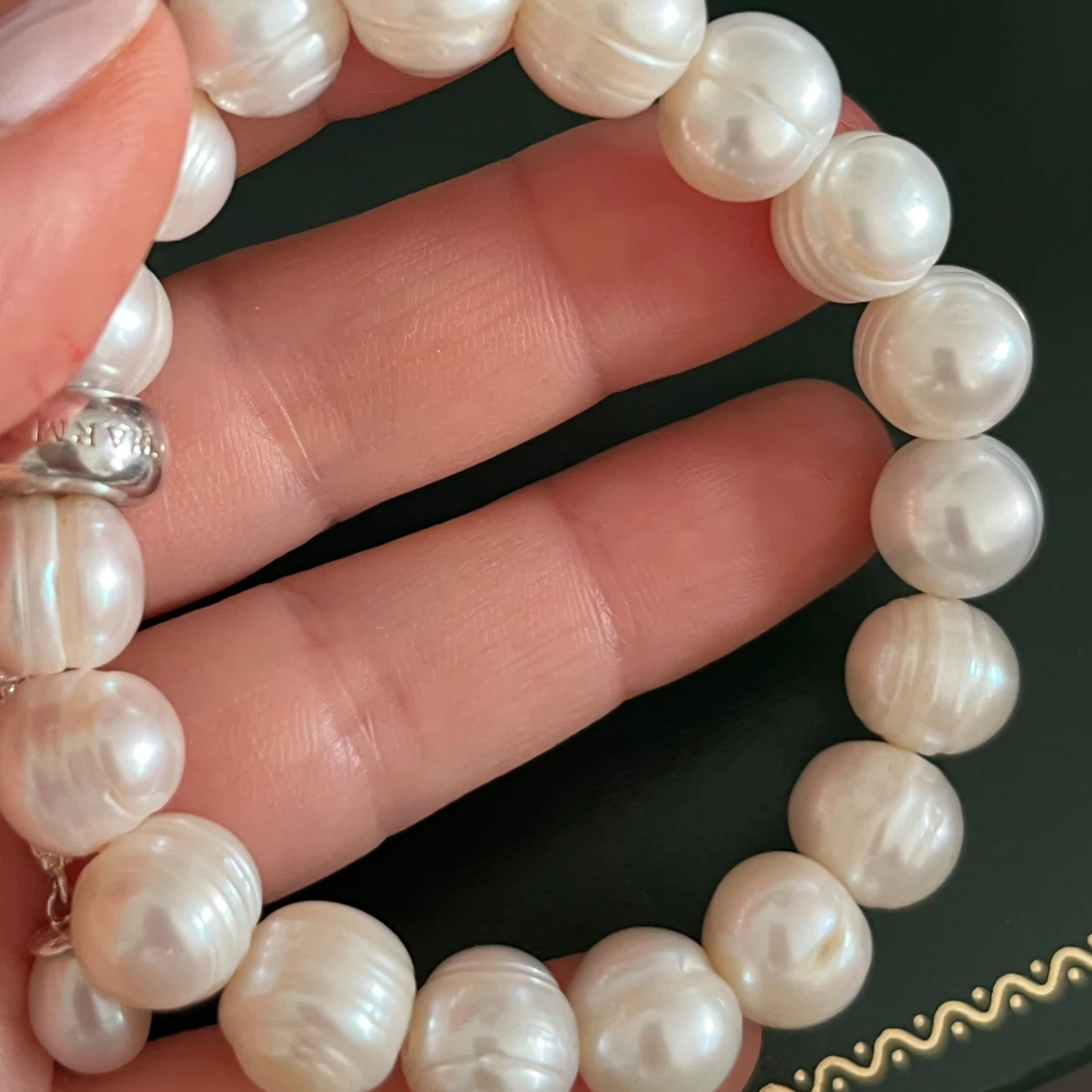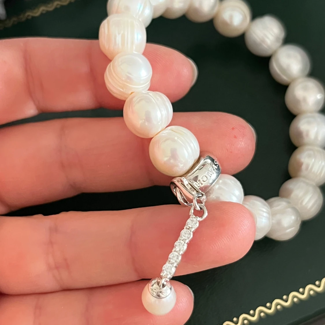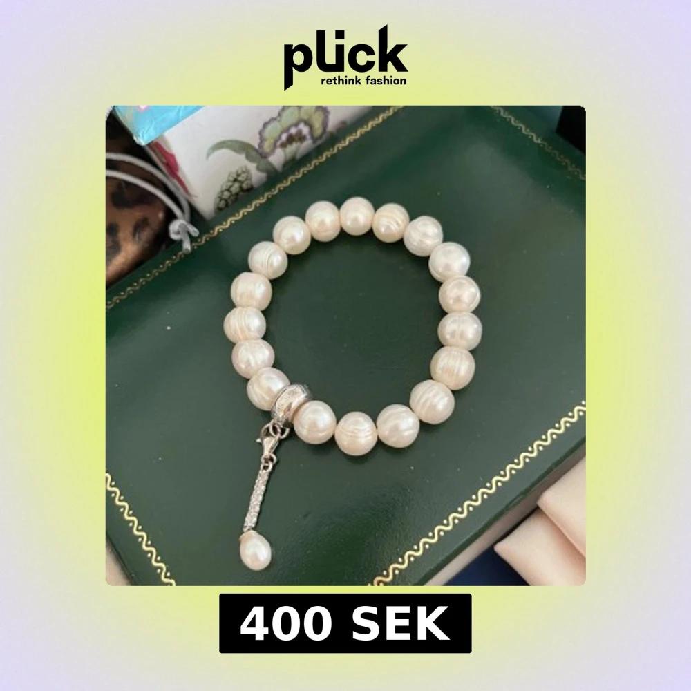 Ett vackert pärlarmband med en elegant berlock/charm från Thomas Sabo. Armbandet består av runda, vita skimrande odlade sötvattenpärlor. Pärlornas diameter är ca 1 cm. Berlocken är i 925 sterlingsilver och prydd med små, glittrande stenar samt en liten pärla längst ner. Perfekt för både vardag och fest. Fler charms kan fästas till. Storlek small, 15 cm, elastisk. Diameter ca 6-7 cm. Nyskick.
