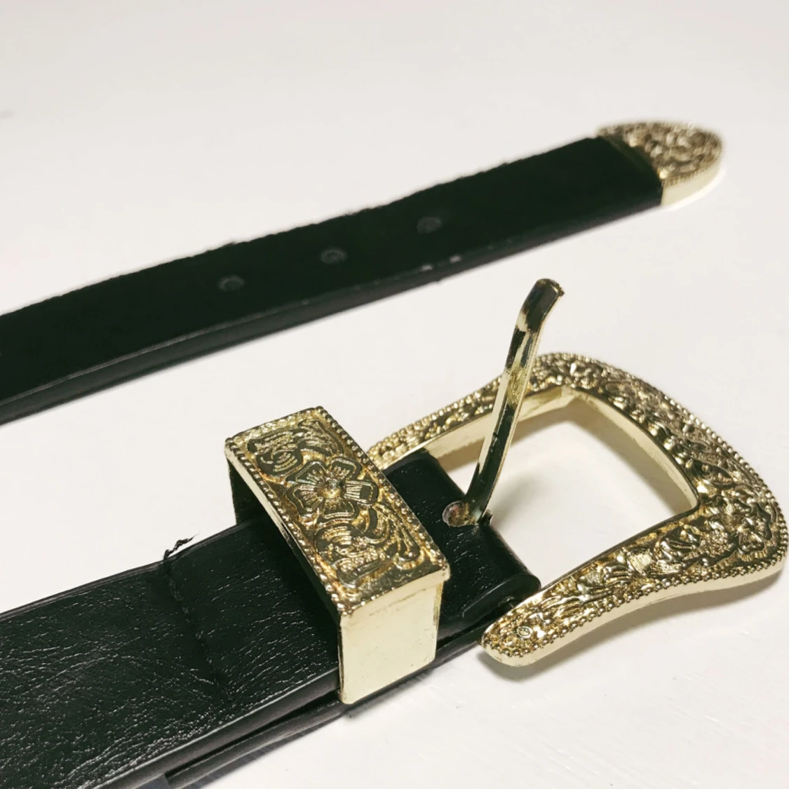 Justerbart, svart bälte med dubbla spännen i guldfärg. Sparsamt använt, ett extrahål gjort. Passar S till M, finns hål kring bägge spännen. 50kr + 10kr frakt. Betalning via Swish.
