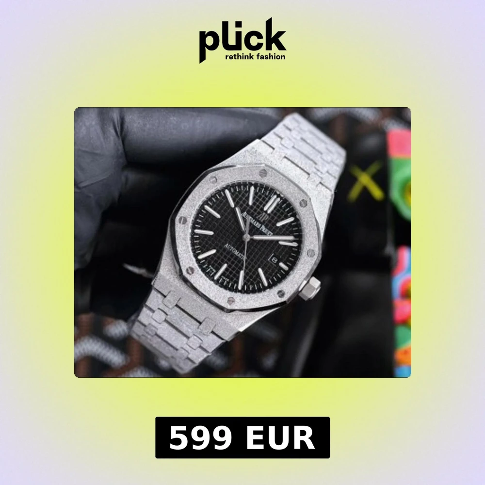 Snygg Audemars Piguet Royal Oak med ikonisk åttakantig boett i silverfärgat stål och svart urtavla med rutmönster. Klockan har automatiskt urverk, datumvisning och länkarmband i borstat stål. Perfekt för dig som gillar exklusiv design och detaljer.
