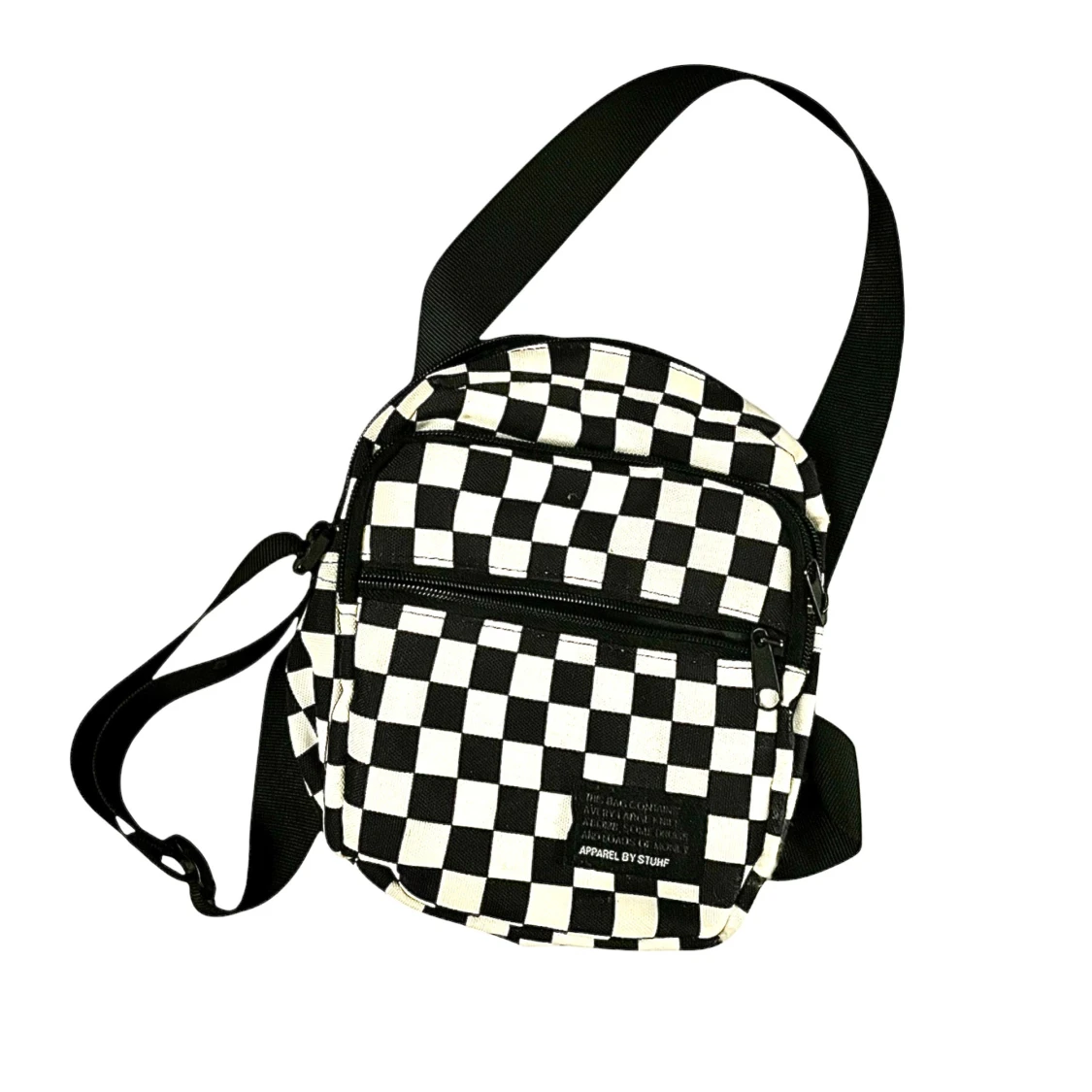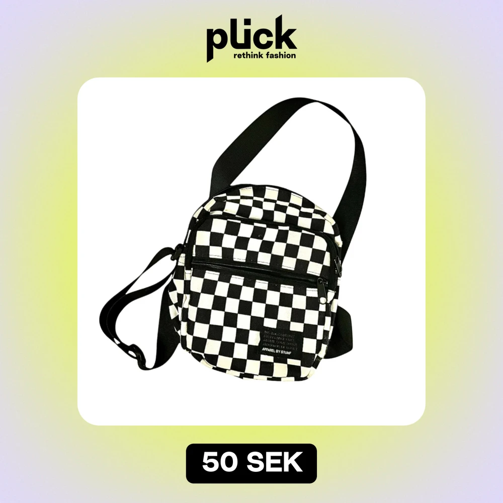 Svart vit rutig axelremsväska. Ungefär lika stor som en hand i storleken. Du kan justera bandet.