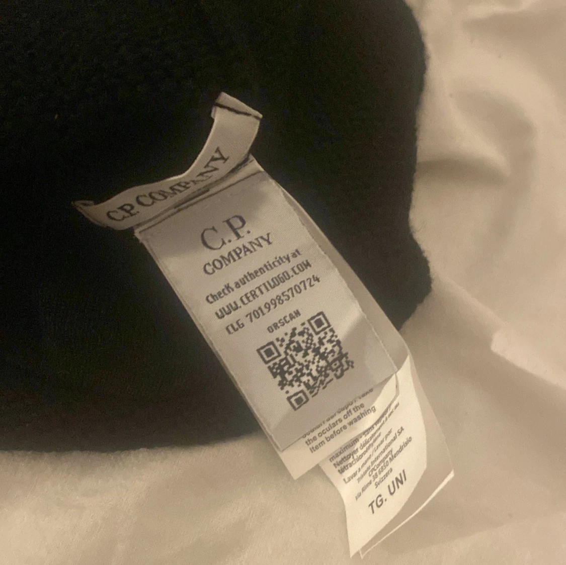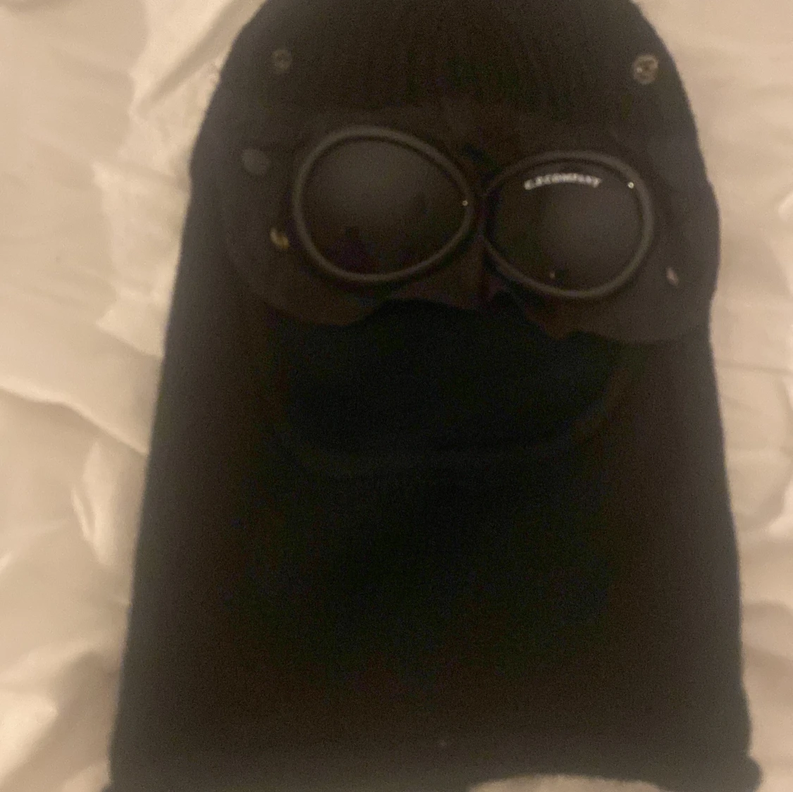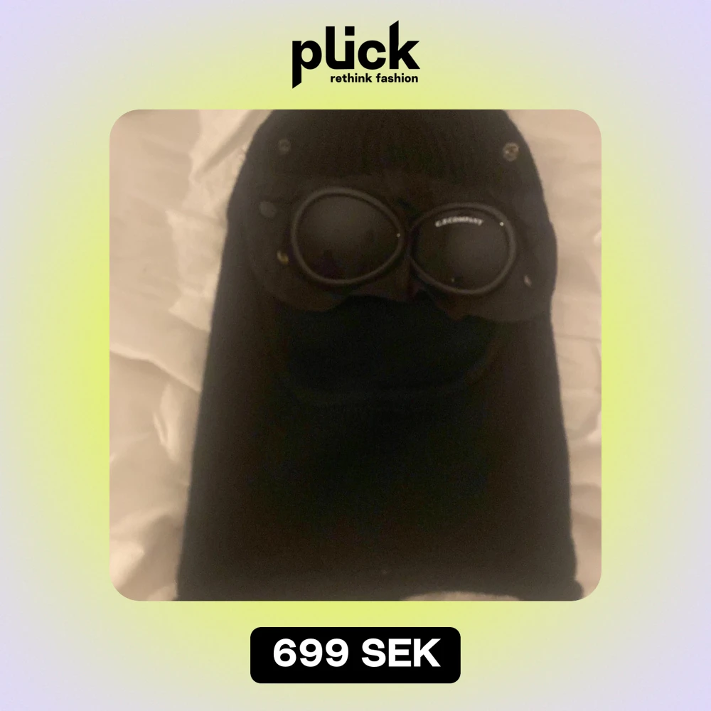 Säljer en cool svart stickad balaklava från C.P. Company. Den har inbyggda glasögon som ger en unik look. Perfekt för vintern och håller dig varm och stilren. Passar de flesta tack vare one size. Ett måste för den modemedvetna!