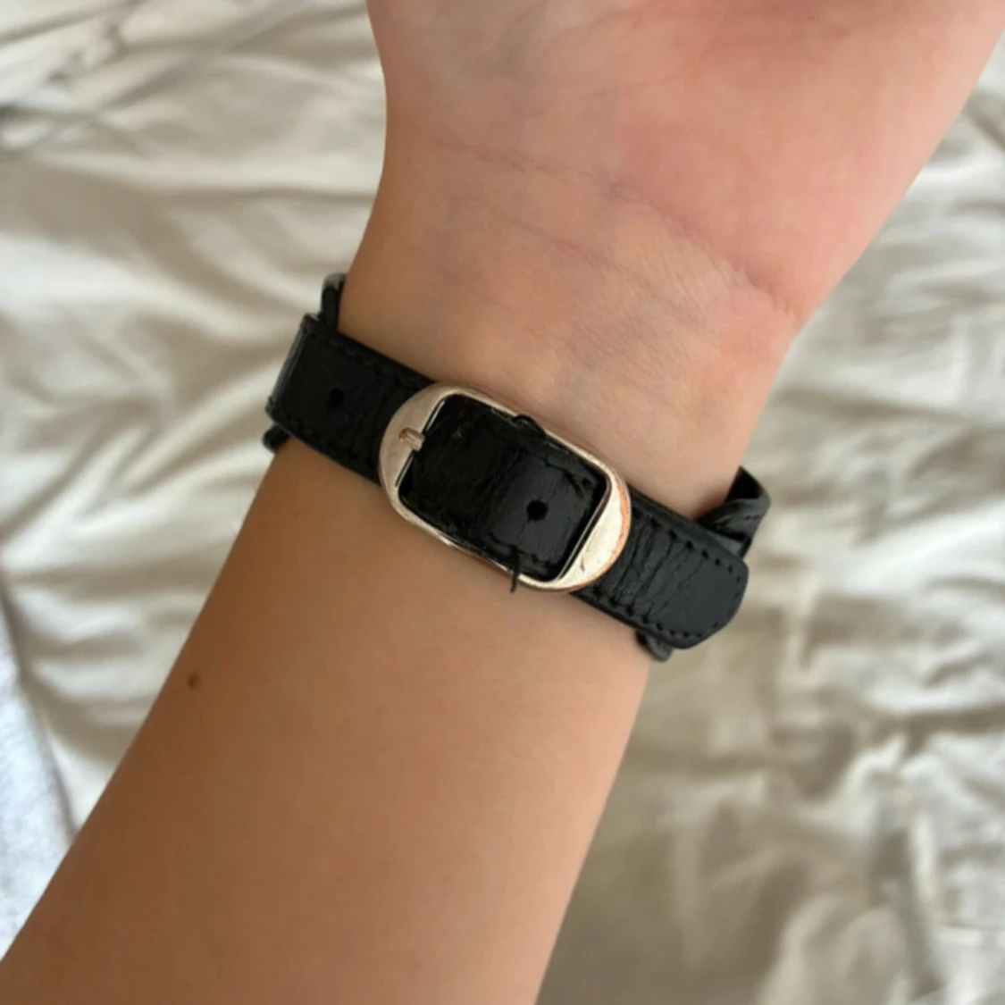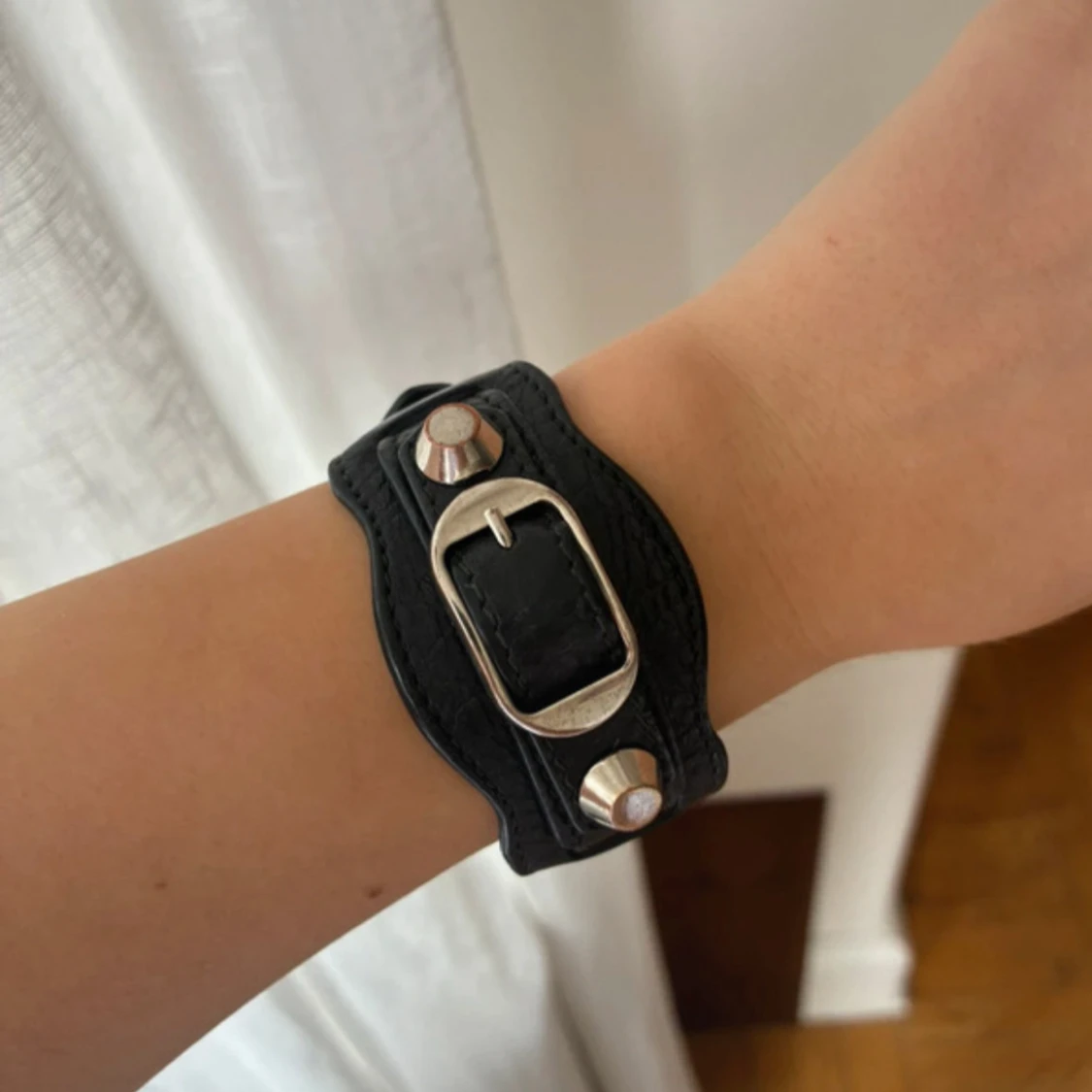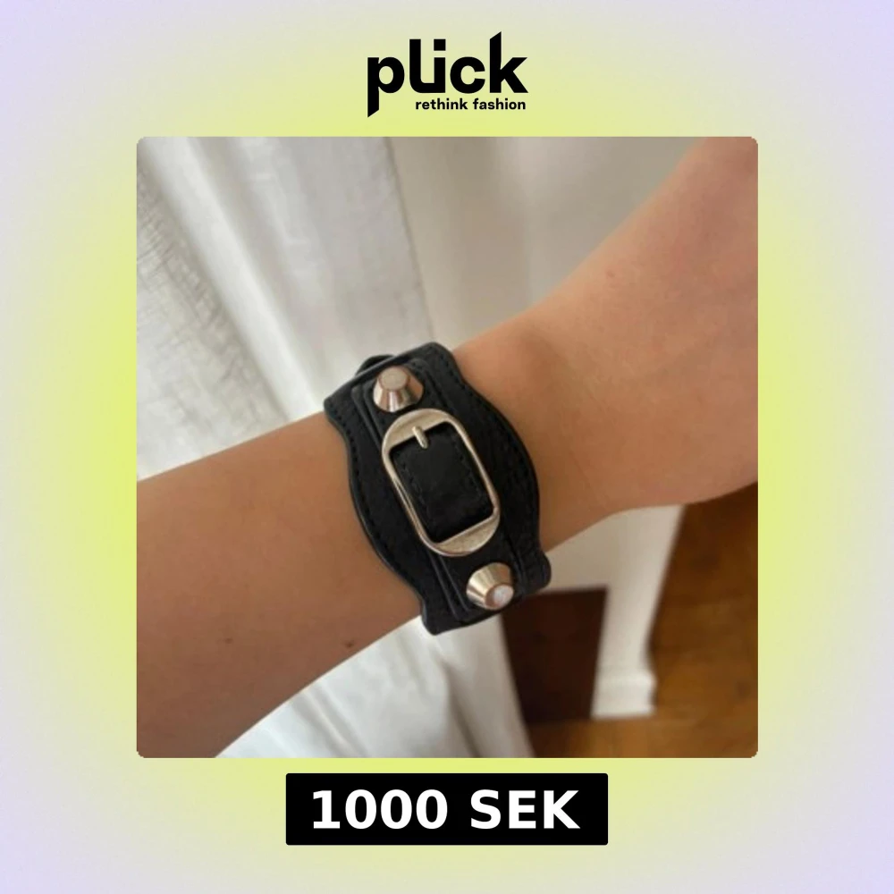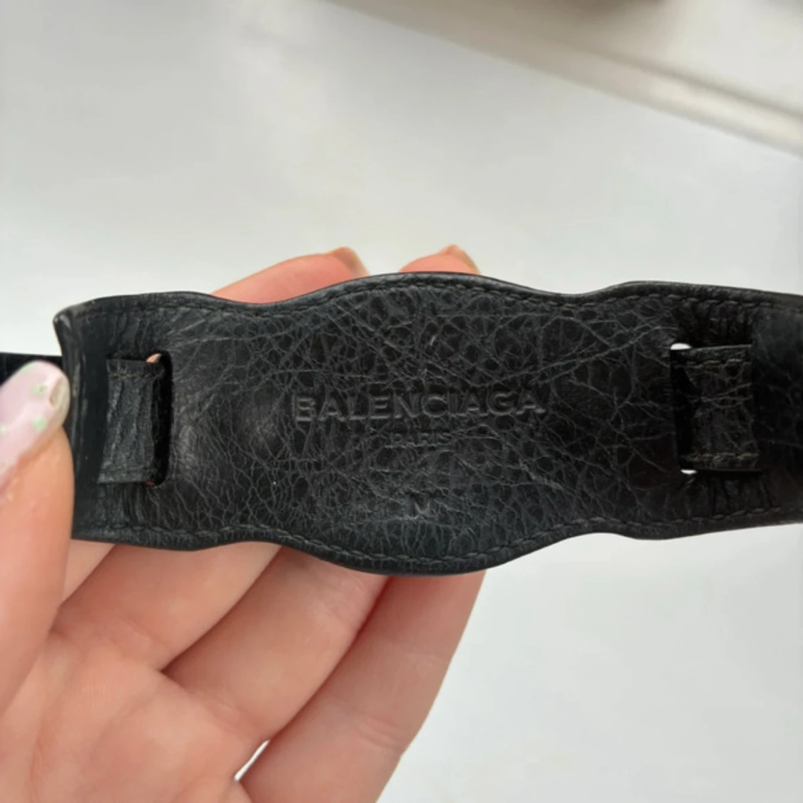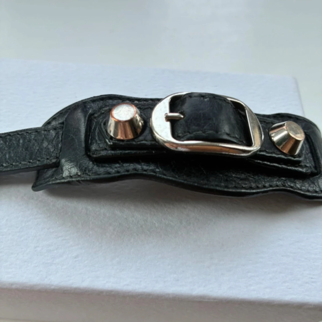 Supercoolt city armband från balenciaga som tyvärr inte kommer till användning. Lite slitning av silverplateringen på nitarna och även lite av sömmarna på bandet men inget man tänker på när man har det på sig, generellt mycket bra skick.