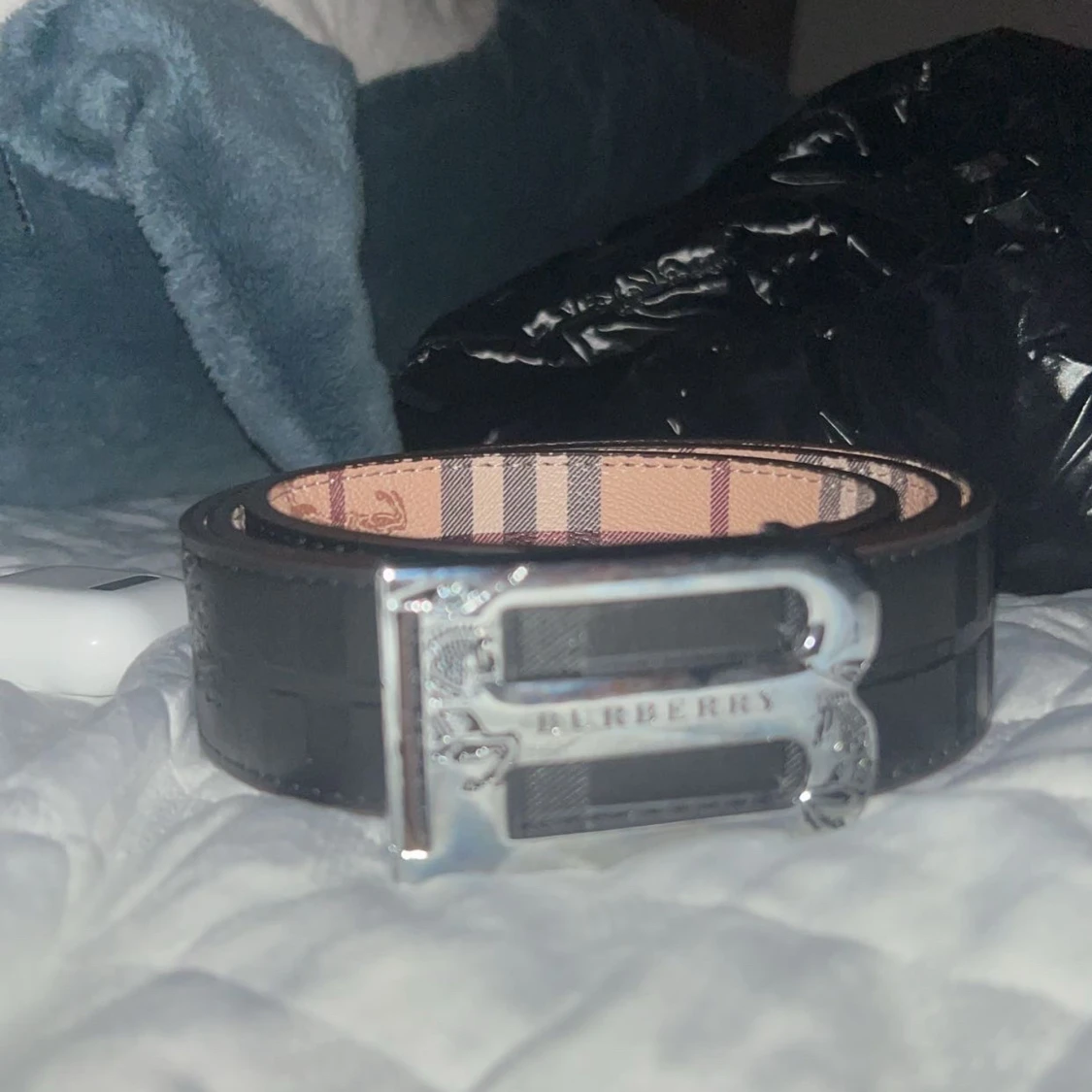 Snyggt svart bälte från Burberry med klassiskt rutigt mönster på insidan och en stor silvrig B-spänne framtill. Bältet är gjort i skinn och har exklusiva detaljer som ger en lyxig känsla. Perfekt accessoar för att lyfta din outfit.