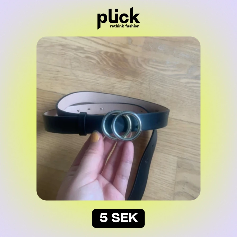 Ett svart bälte med gulddetalj i form av två ringar fram från HM. Storleken är S. Det har gjorts tre extra hål (som går att se på bild 3) Bältet är i bra skick.