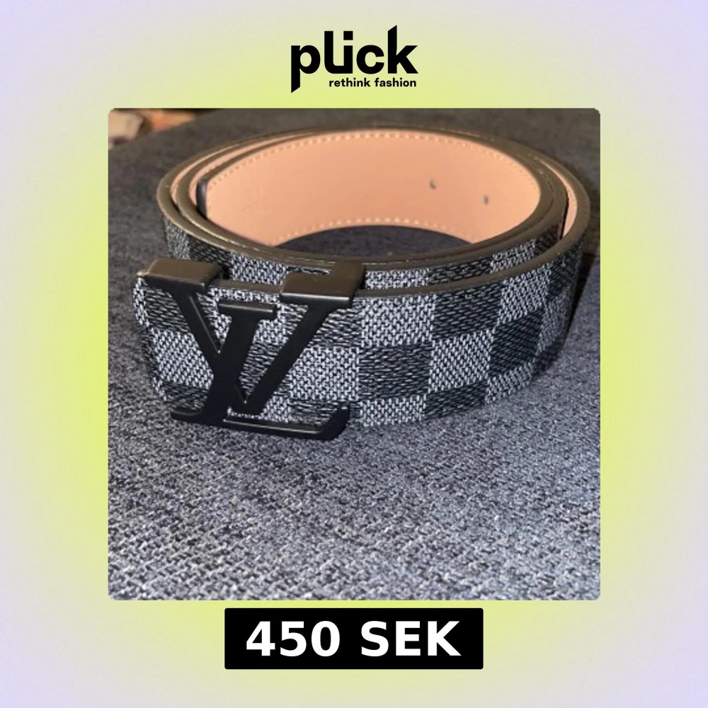 Säljer ett svart bälte från Louis Vuitton med klassiskt rutigt mönster och stor LV-logga på spännet. Bältet har en stilren design och insidan är ljusbrun. Perfekt accessoar för att lyfta din outfit.
