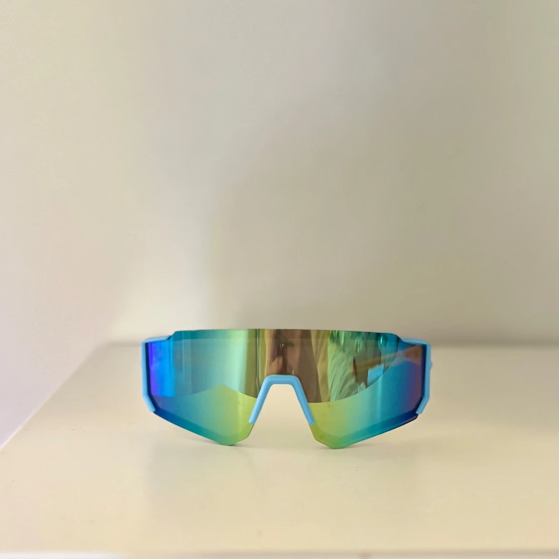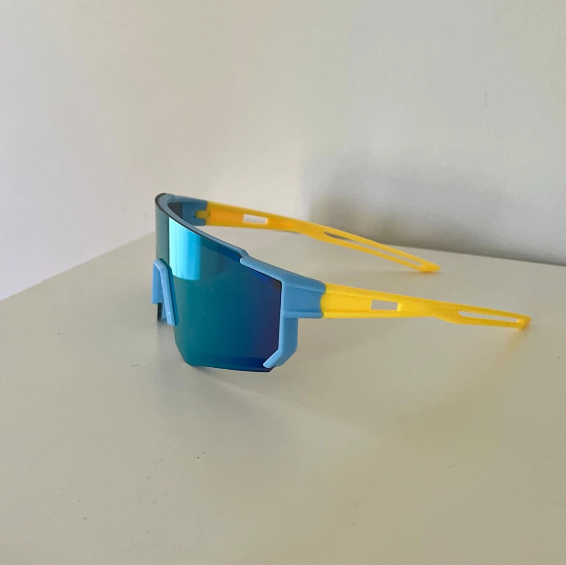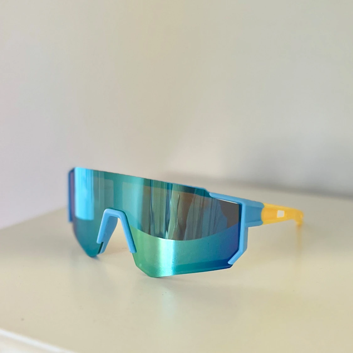 Säljer ett par futuristiska sportglasögon med spegelblå/gröna linser, blå båge och gula skalmar. De har en skarp, kantig design och ger riktigt cool vibe. Perfekta för dig som vill sticka ut på cykeln eller löprundan😎