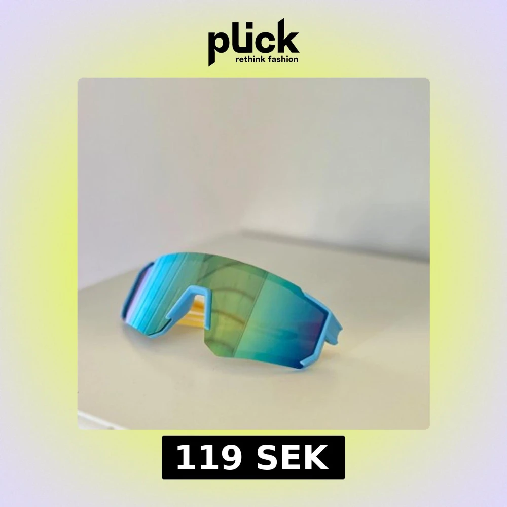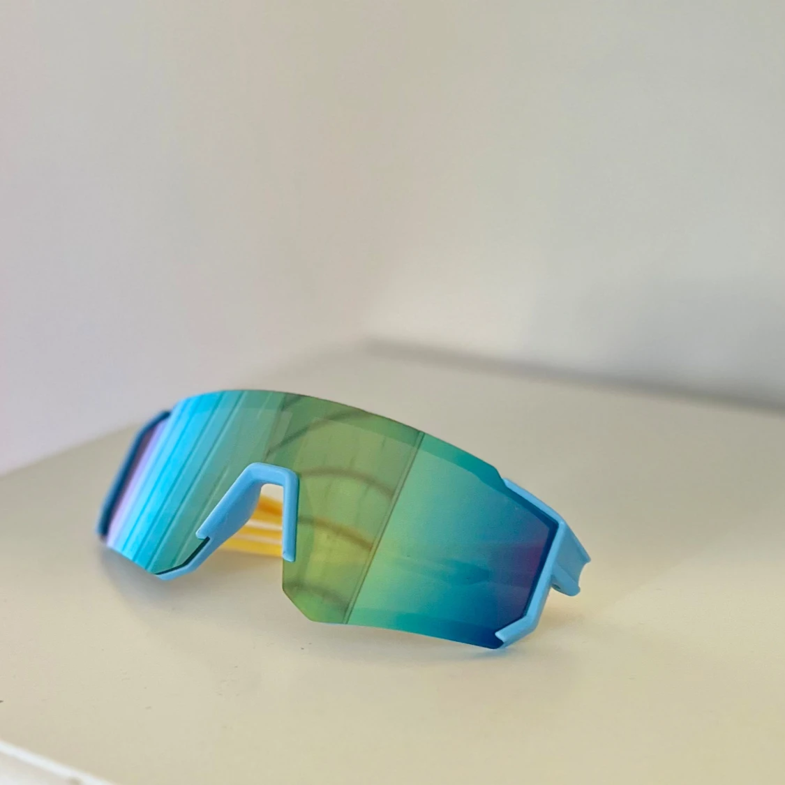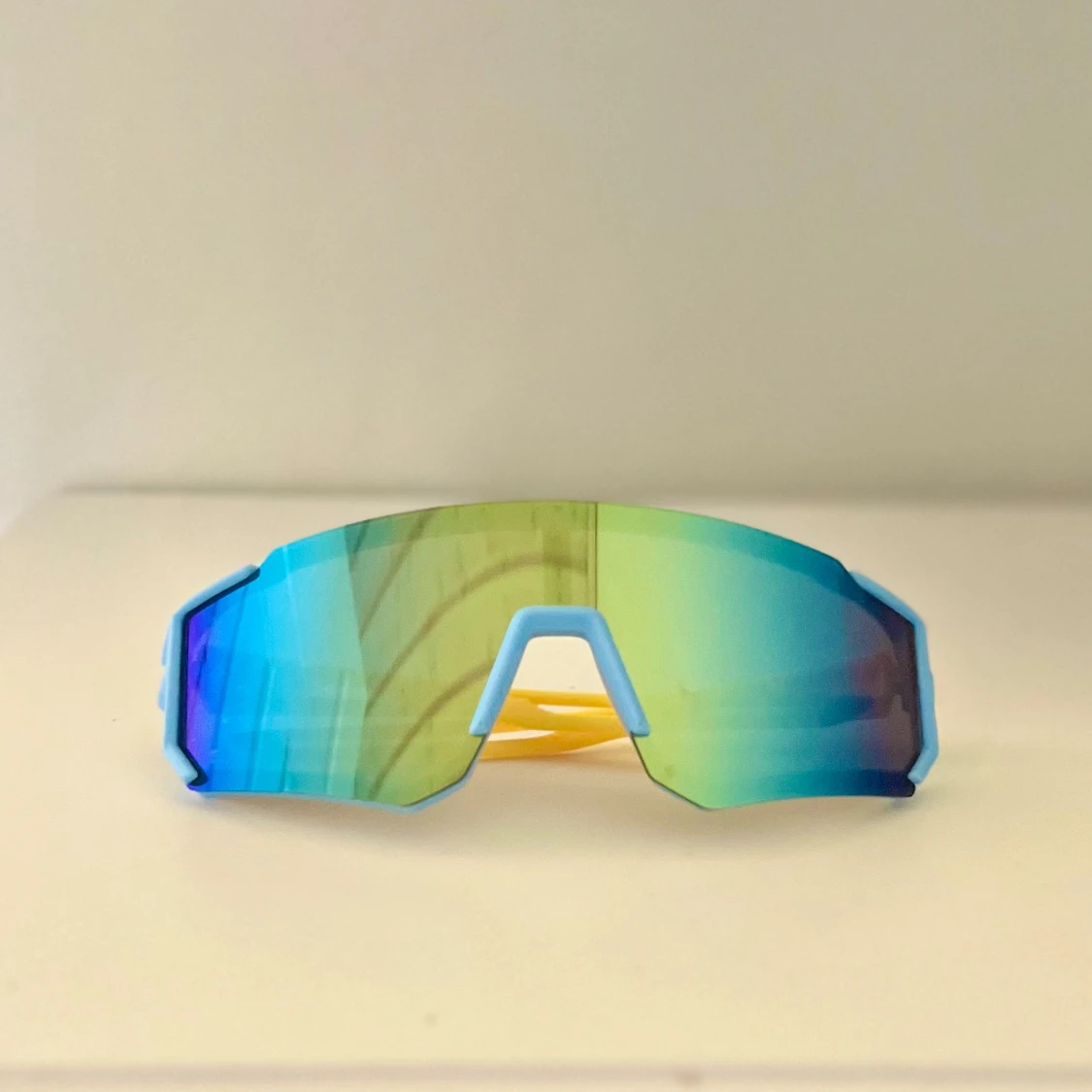 Säljer ett par futuristiska sportglasögon med spegelblå/gröna linser, blå båge och gula skalmar. De har en skarp, kantig design och ger riktigt cool vibe. Perfekta för dig som vill sticka ut på cykeln eller löprundan😎