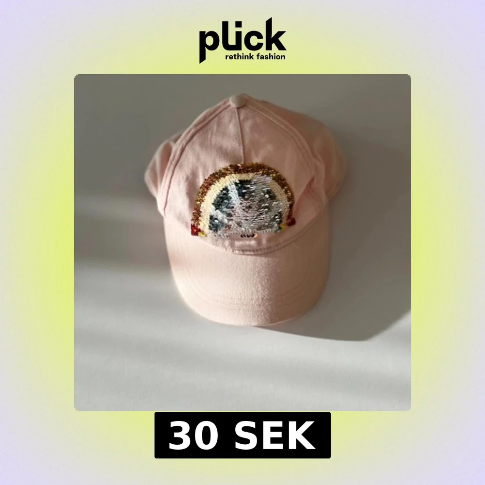 Söt ljusrosa keps från H&M i bomull med en glittrig regnbåge av paljetter framtill. Klassisk form med böjd skärm och justerbar baksida. Perfekt för att addera lite färg och glitter till din look.