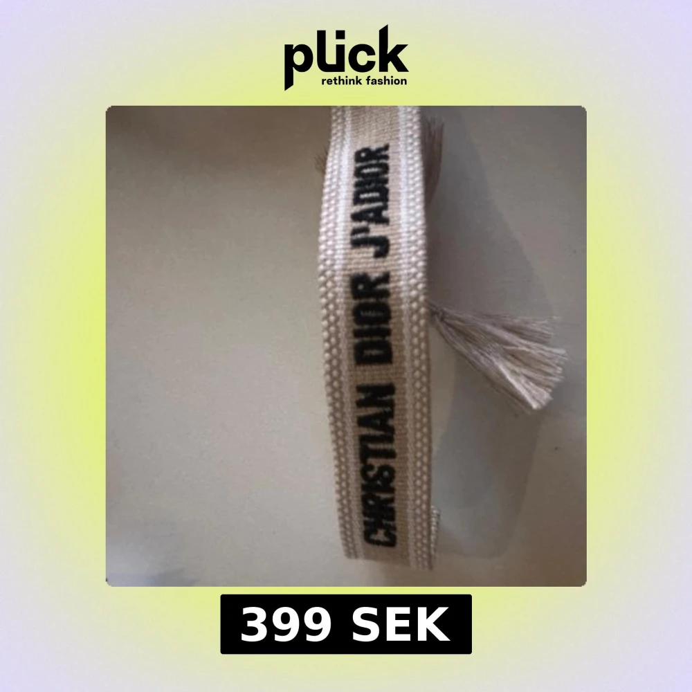 Säljer ett beige armband från Christian Dior med texten 'J'ADIOR' i svart. Armbandet har tofsar i ändarna och är gjort i ett vävt material. Perfekt accessoar för att lyfta din outfit.