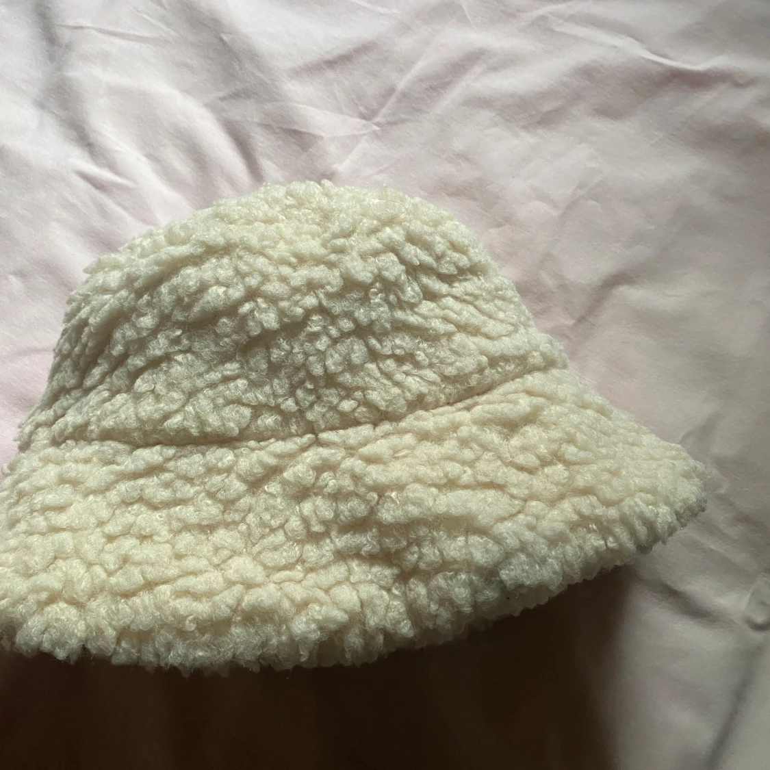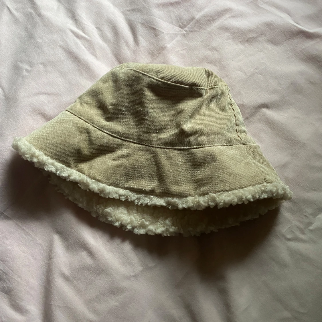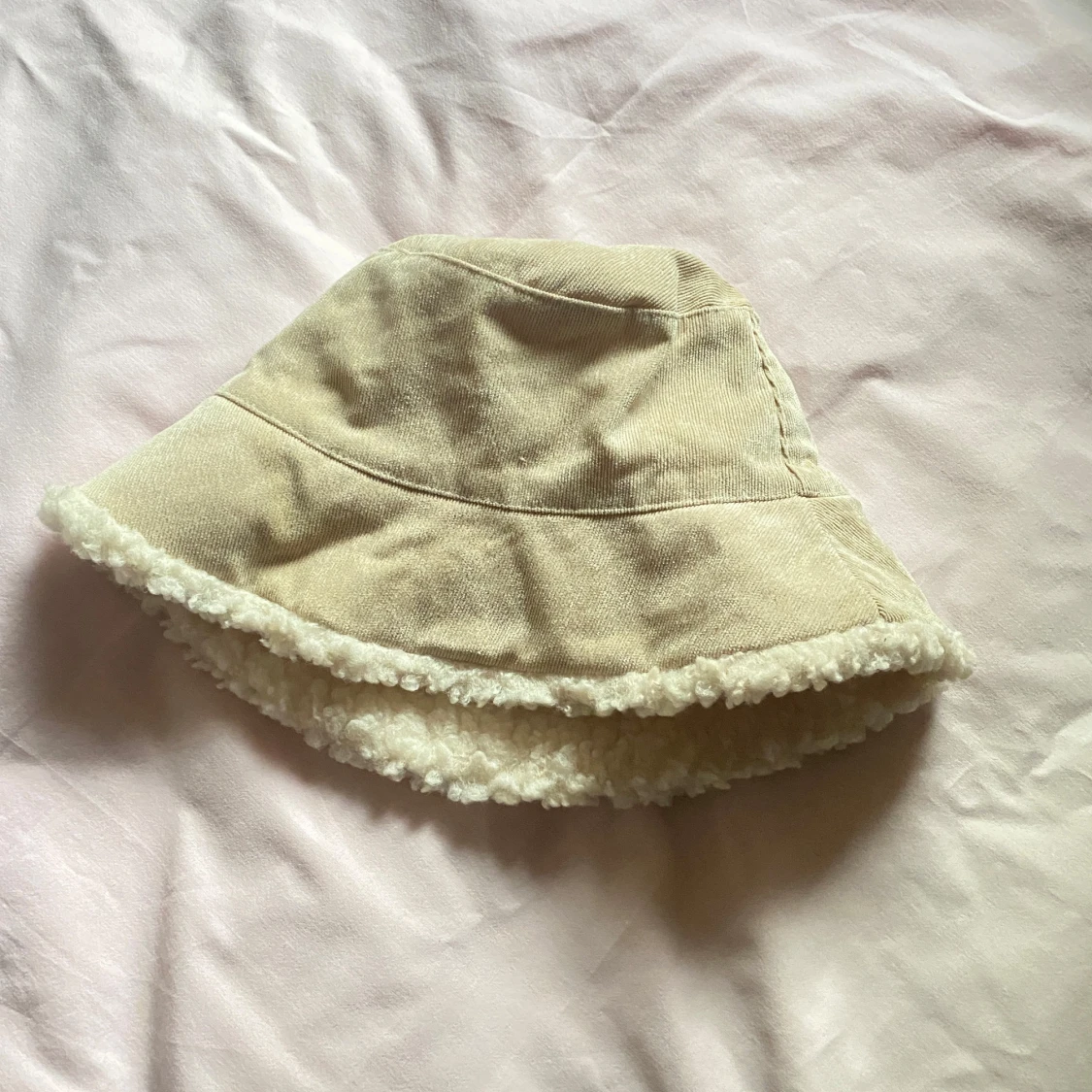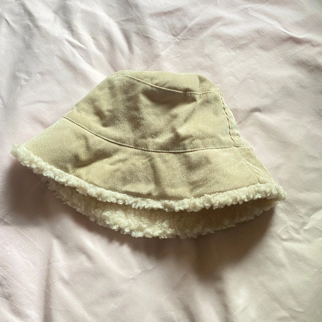 Säljer en mysig beige bucket hat med teddyfoder. Hatten har en mjuk och fluffig insida som håller dig varm under kyliga dagar. Perfekt för höst och vinter!