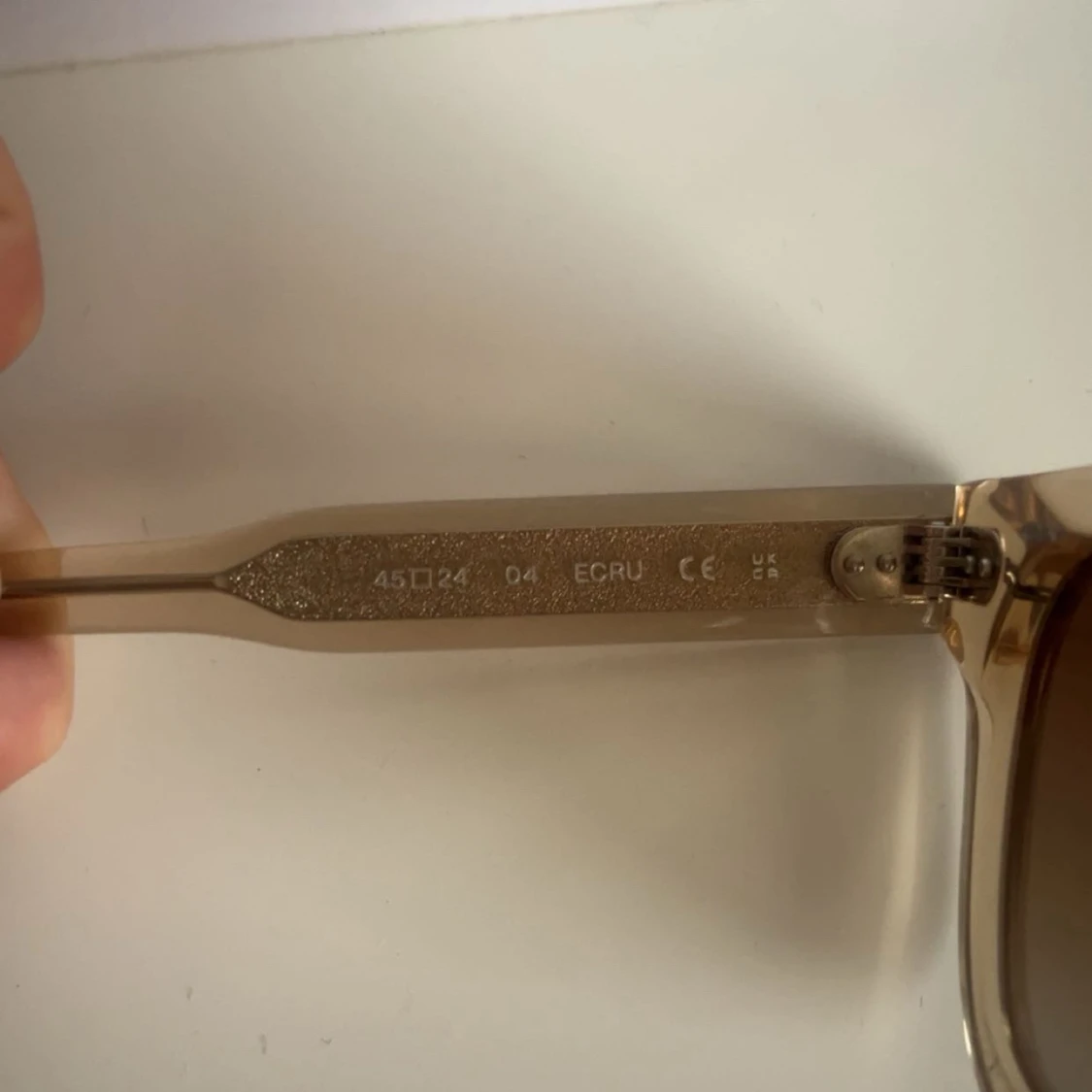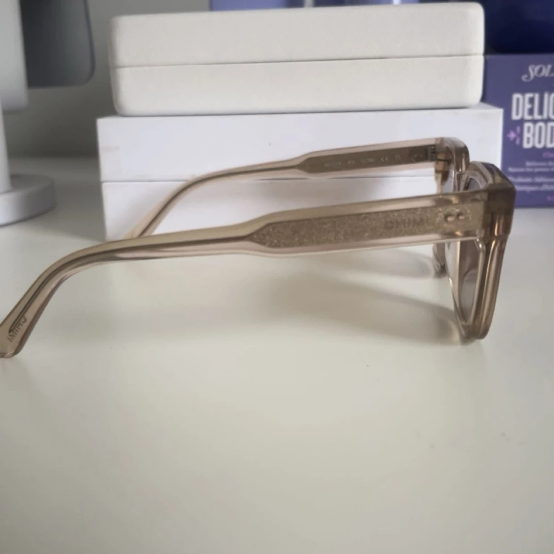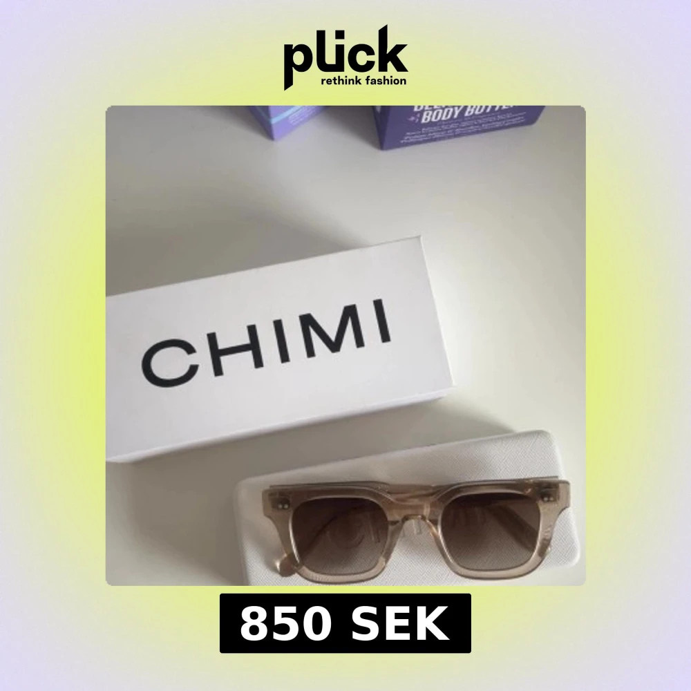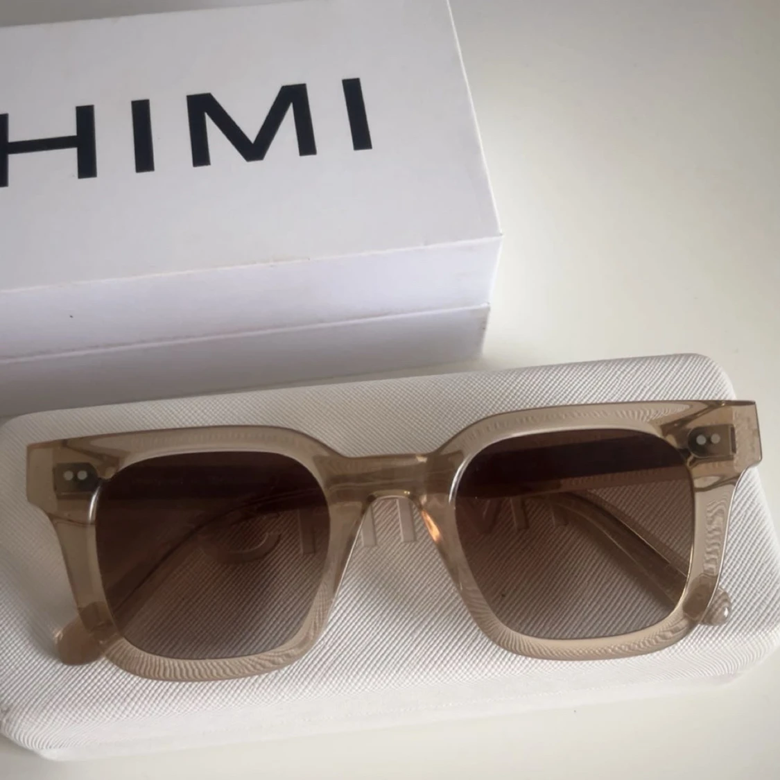 Snygga solglasögon från CHIMI i färgen ecru/beige med transparent båge och fyrkantig form. Glasen är bruna och bågarna är i ett stilrent, plastigt material. Perfekta för att lyfta din look med en clean vibe. pris kan diskuteras!
