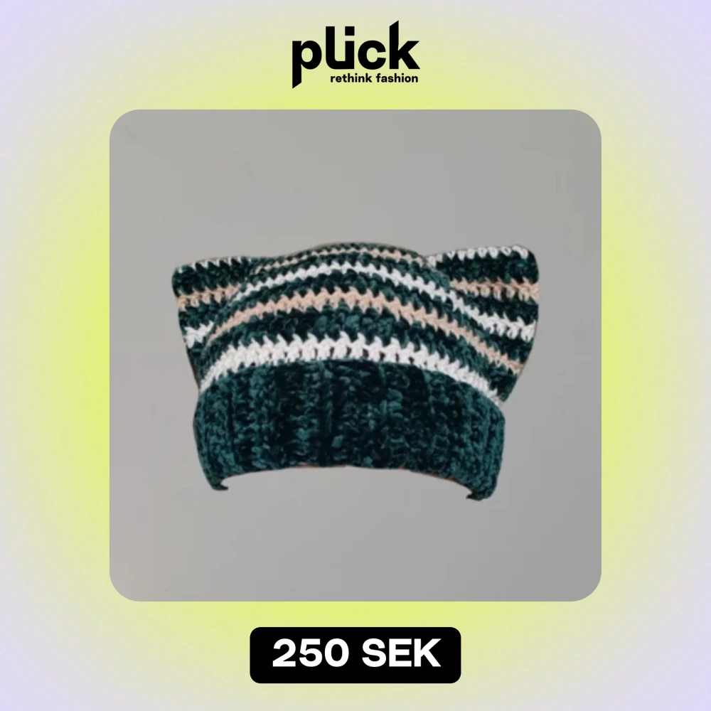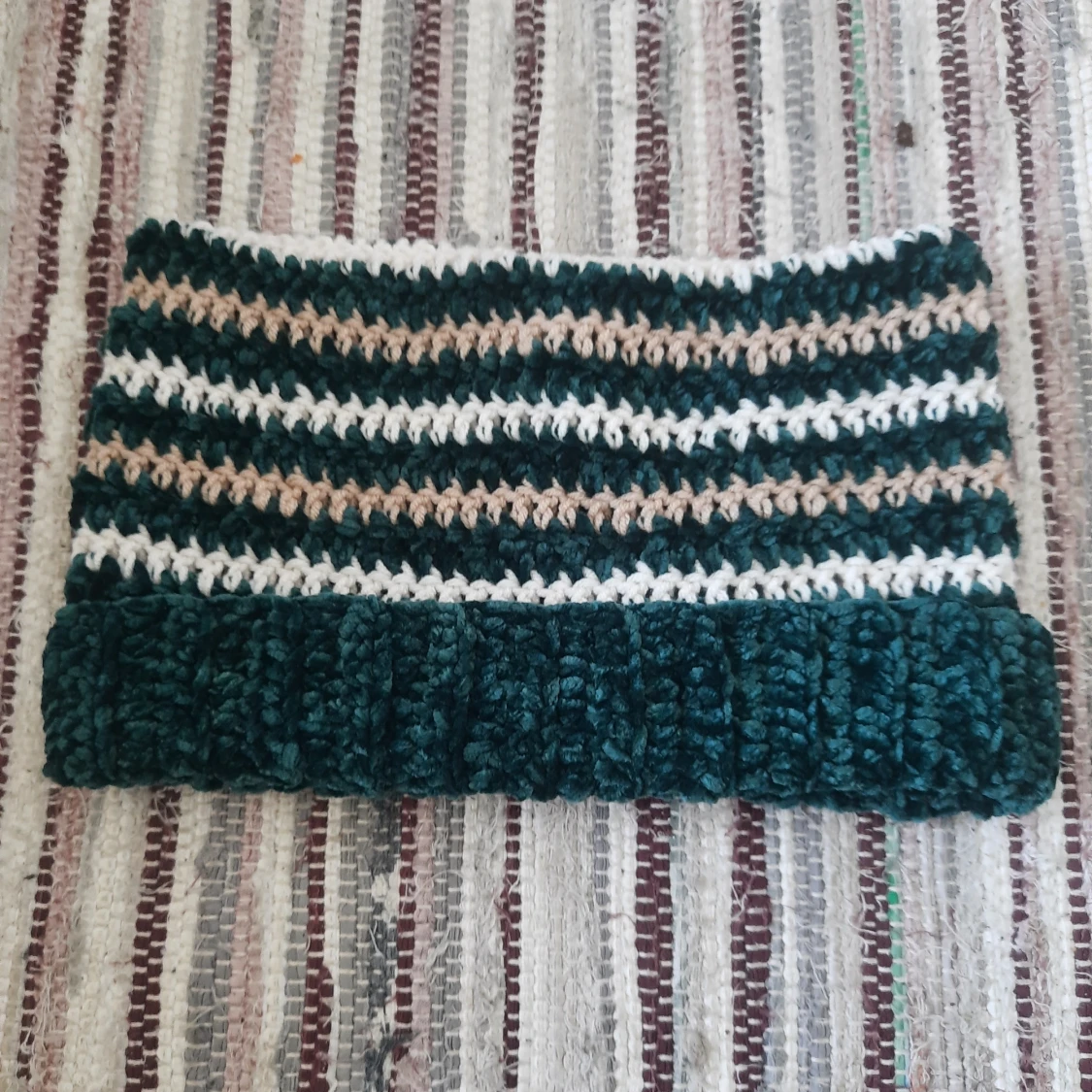 Säljer en superfin handvirkad mössa med ränder i mörkgrön, beige och vit. Den har en ribbad kant som gör att den sitter bra på huvudet. Perfekt för kyliga dagar när du vill hålla dig varm och se snygg ut samtidigt!