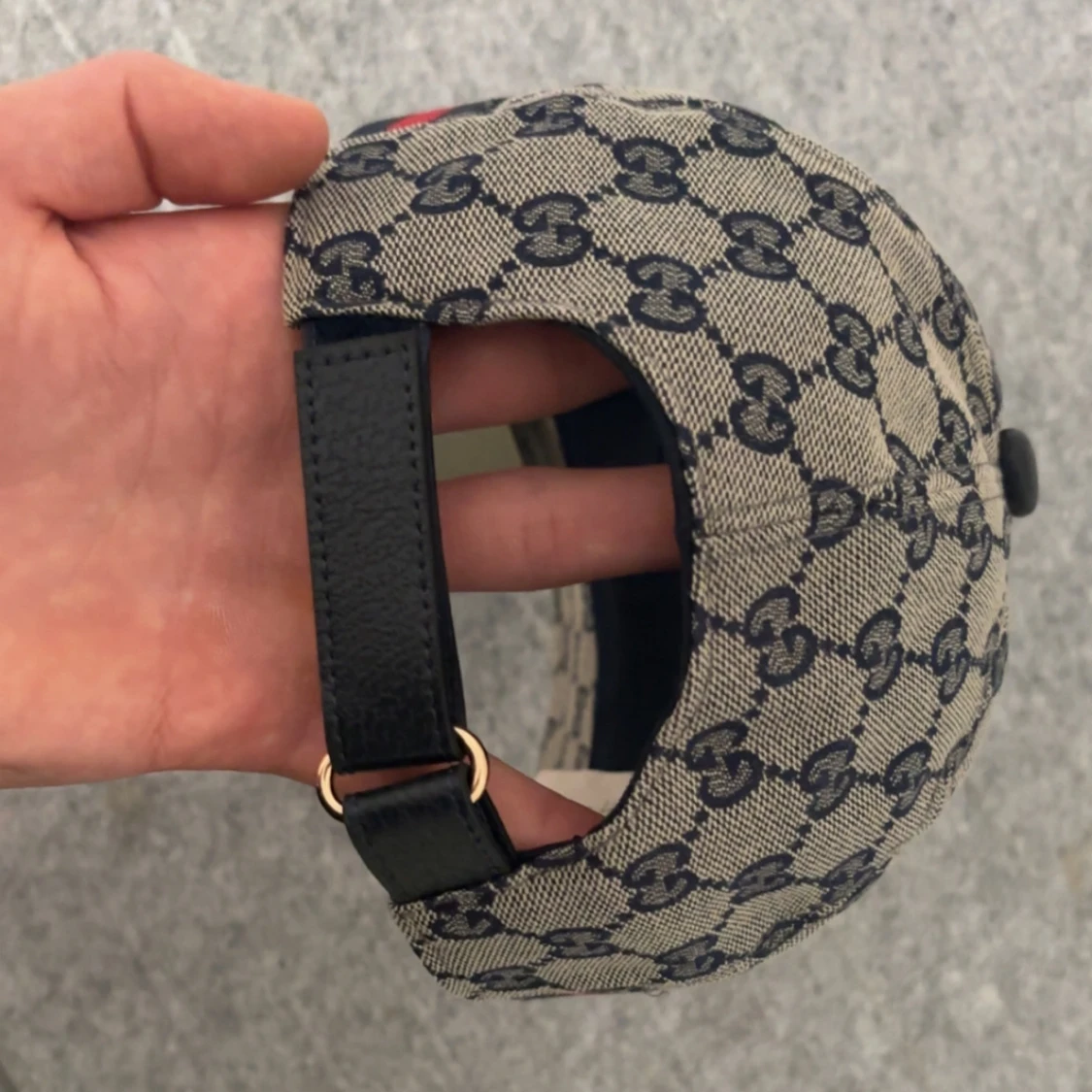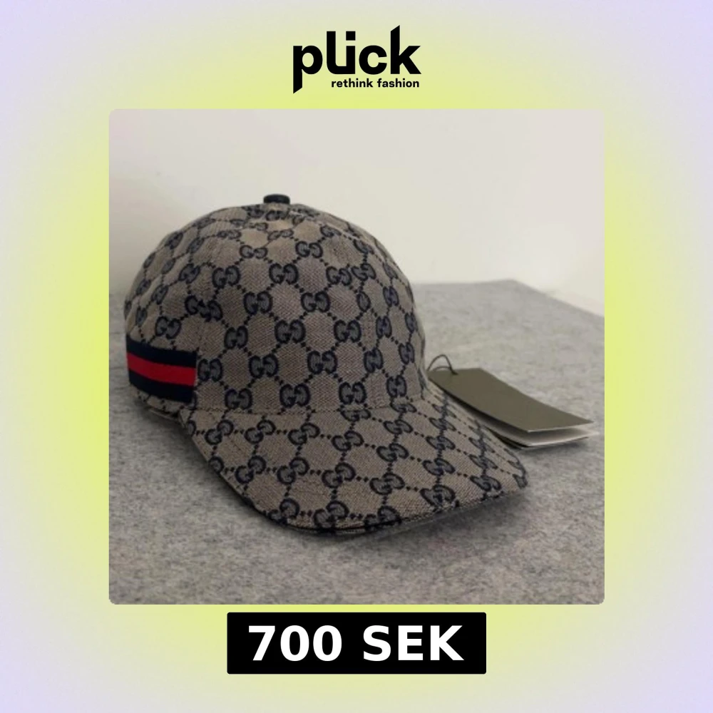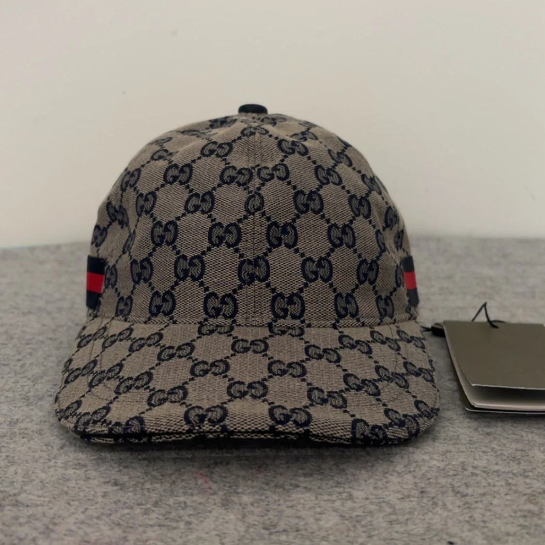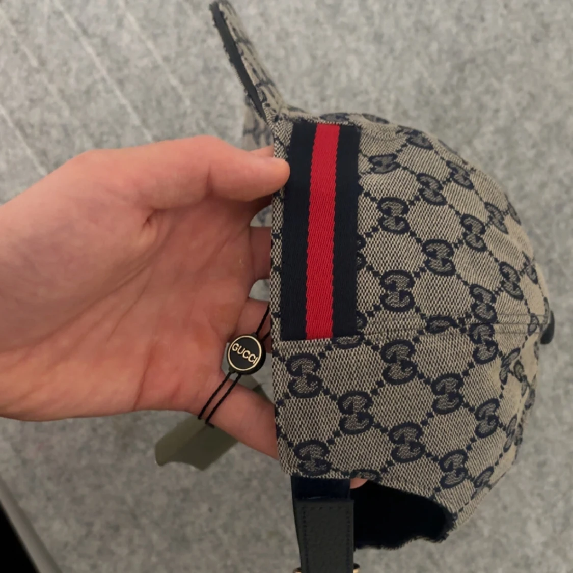 Skriv dm för video eller prisförslag .Säljer en beige keps från Gucci med klassiskt GG-monogram i mörkblått och röd-blå rand på sidan. Justerbart spänne bak i svart skinn. Perfekt accessoar för en trendig look. Strolek ”M”