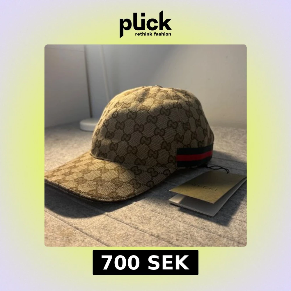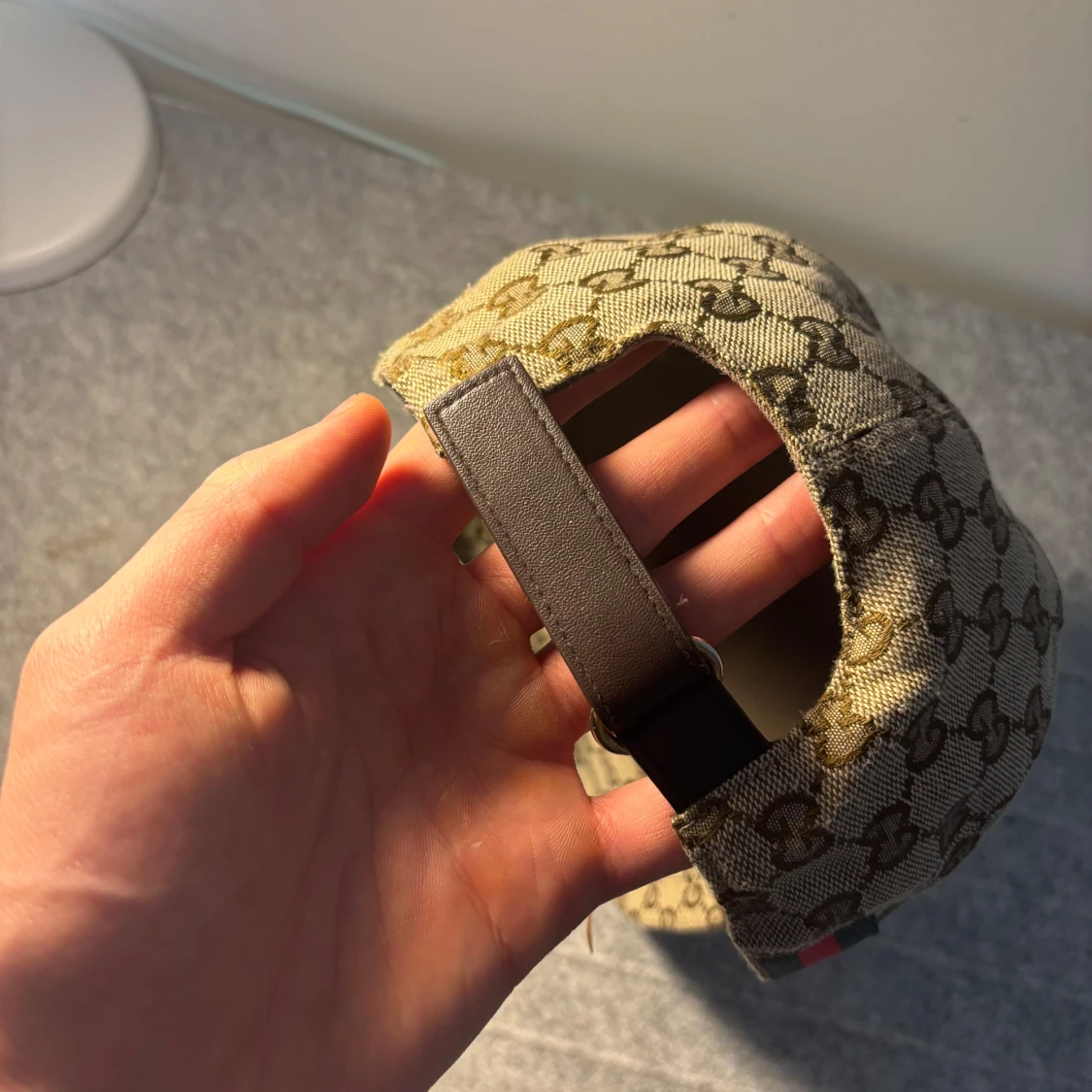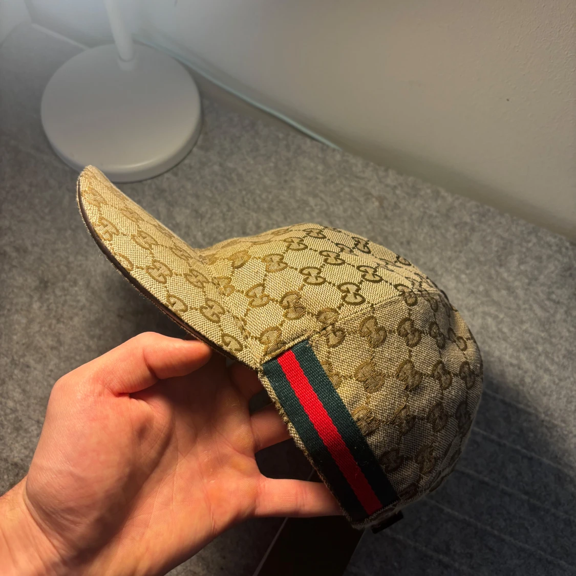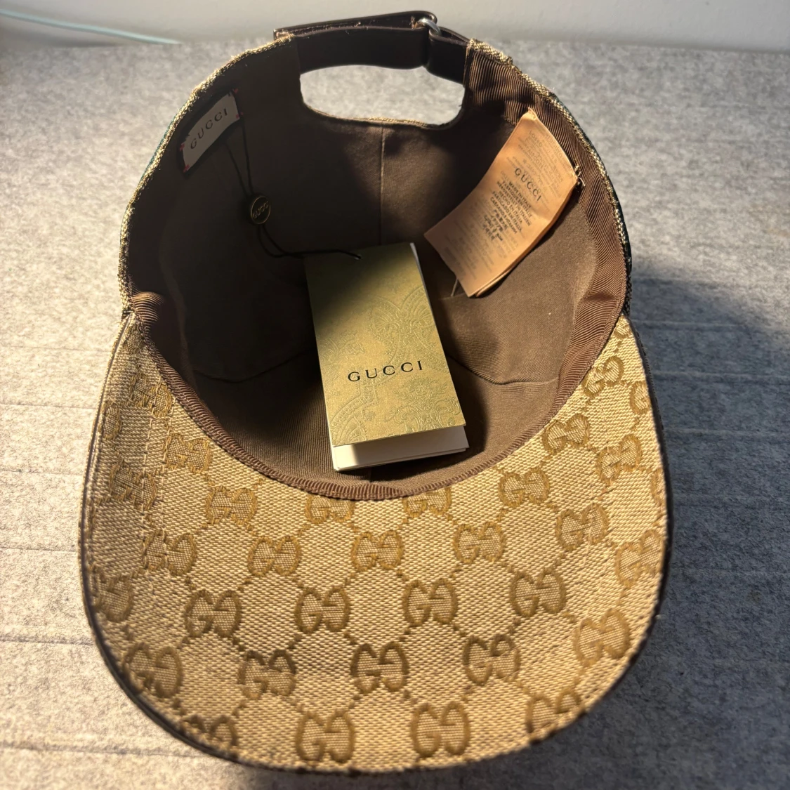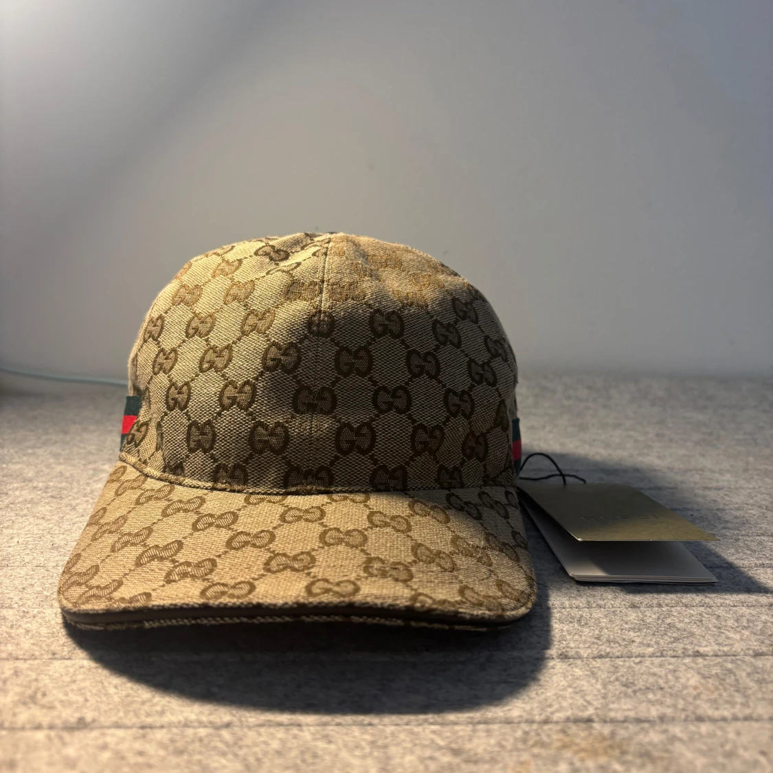 Skicka dm för video. Storlek ”M”. Snygg beige keps från Gucci med klassiskt GG-monogram över hela kepsen. Kepsen har justerbart spänne bak i brunt skinn och ikoniska röd-gröna ränder på sidan. Tillverkad i bomullscanvas med exklusiv känsla, perfekt för dig som vill sticka ut.