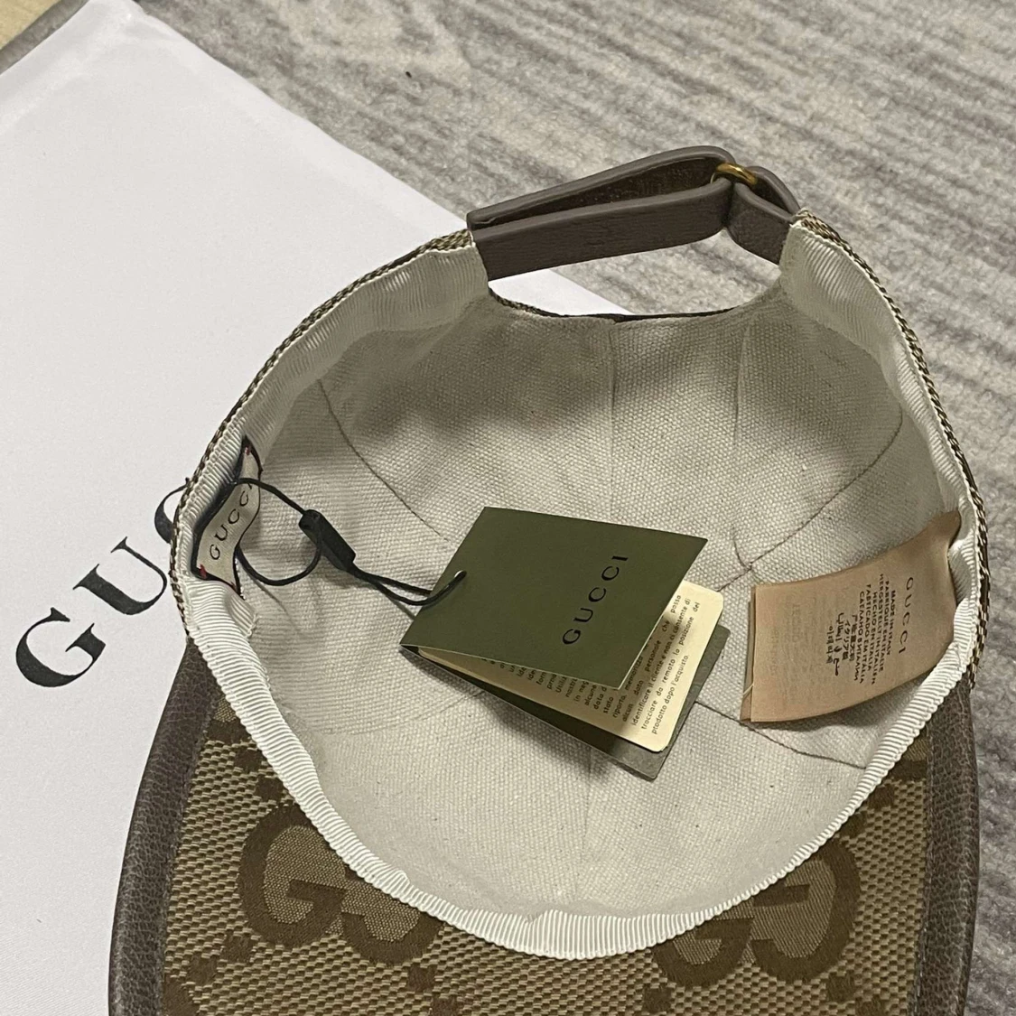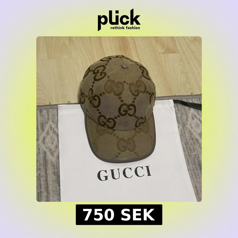 Säljer en beige keps från Gucci med det klassiska GG-mönstret i brunt. Kepsen har böjd skärm och justerbar rem baktill. Perfekt accessoar för dig som gillar lyxiga märken och stilren design.