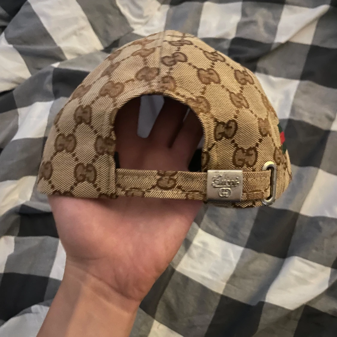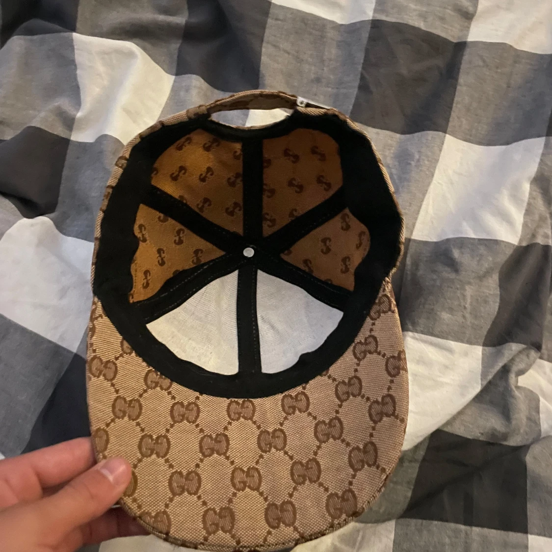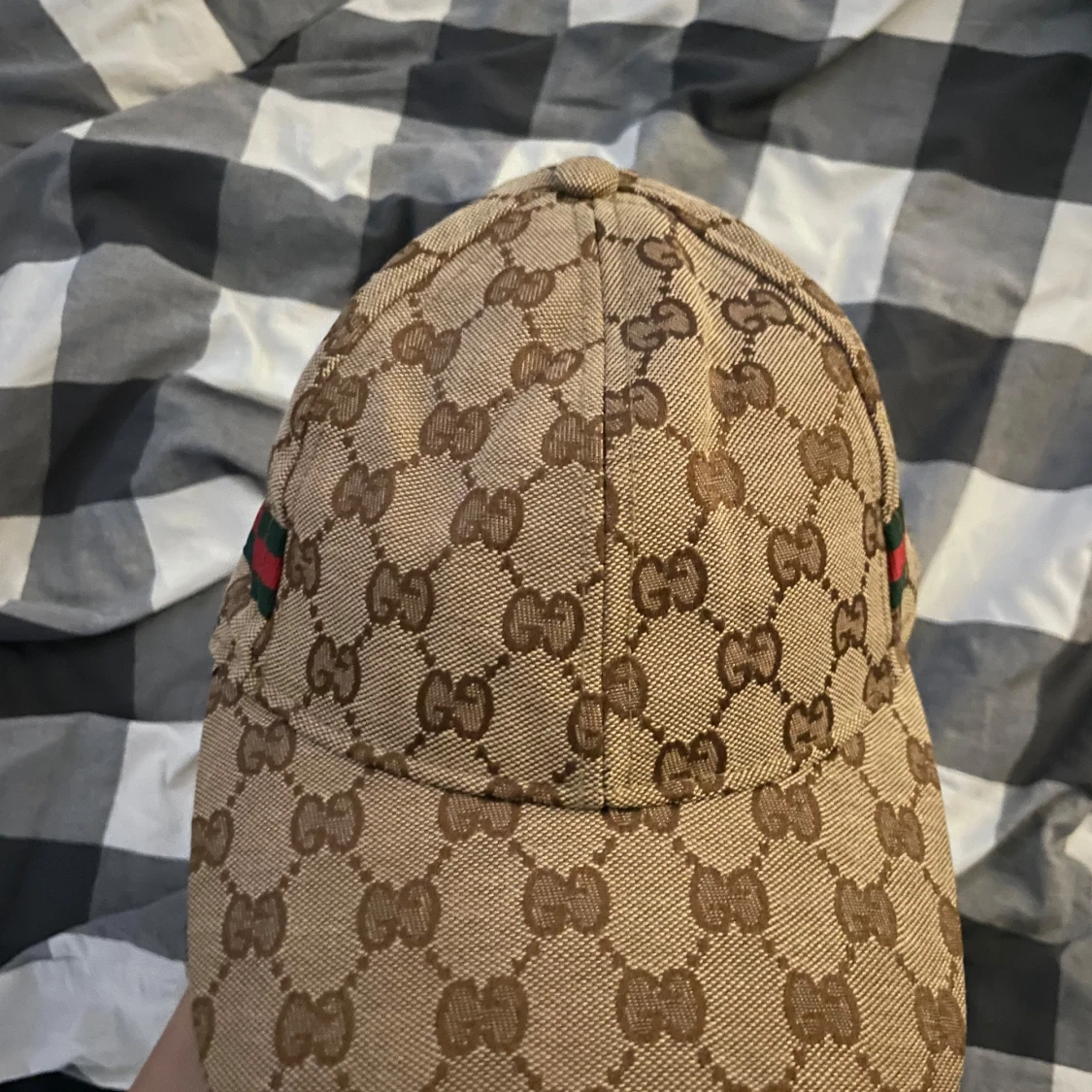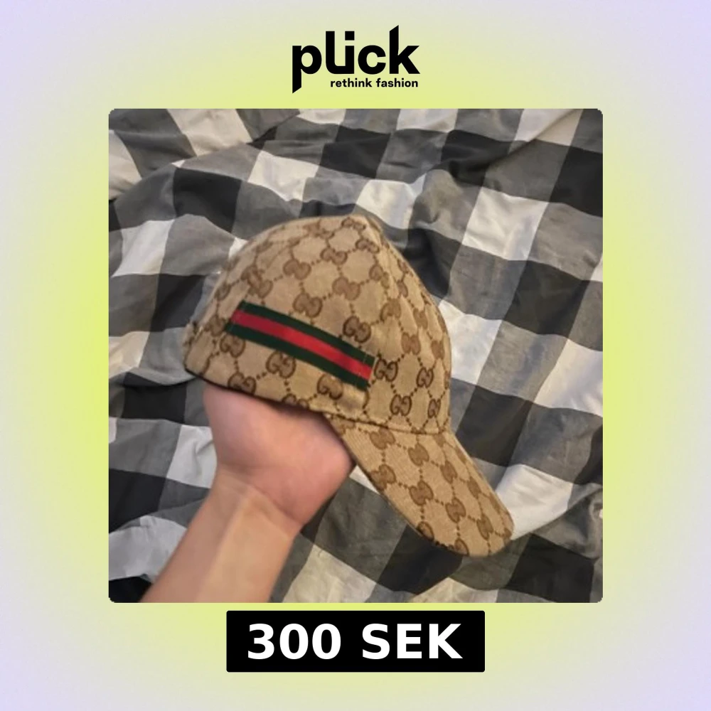 Säljer en beige keps med klassiskt GG-monogram över hela kepsen och en grön-röd rand på sidan. Justerbar metallspänne baktill. Snygg och lyxig accessoar som lyfter din stil. Skriv innan ni köper