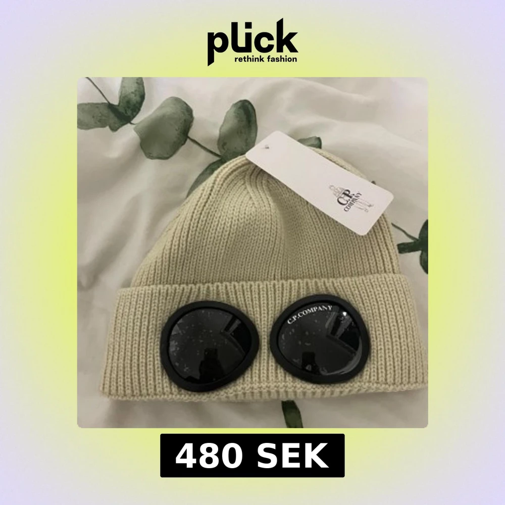 Snygg beige stickad mössa från C.P. Company med unika glasögondetaljer framtill. Perfekt för att hålla stilen under kyliga dagar.