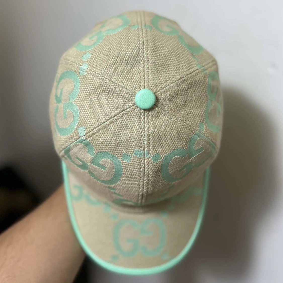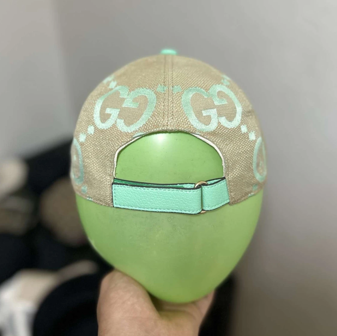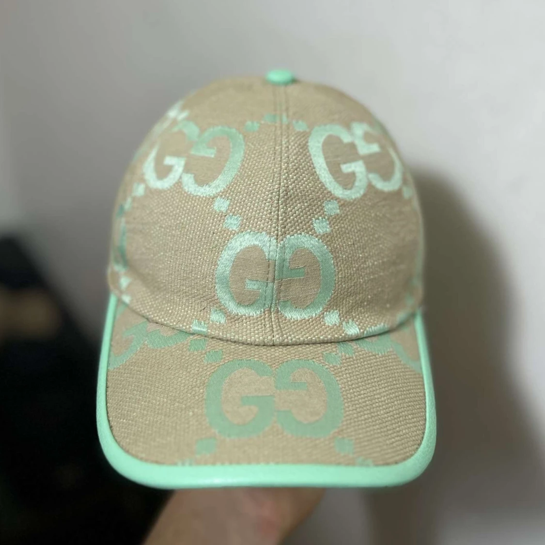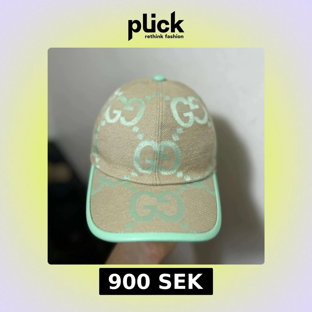 Snygg keps från Gucci i beige canvas med mintgröna GG-loggor och detaljer. Kepsen har böjd skärm och justerbart spänne bak i mintgrönt. Perfekt för dig som vill sticka ut med en exklusiv accessoar. Sommaren blir bättre med en mintgrön keps från Gucci😉🌞☀️