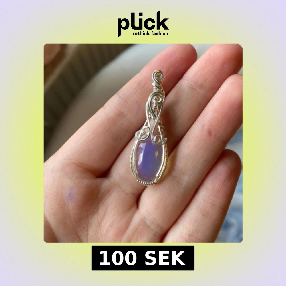 Unik handgjord halsbandspendel med en oval, lila sten som skimrar i ljuset. Infattningen är i silverfärgad metall med snygga snirkliga detaljer och tvinnad kant. Perfekt för dig som gillar boho eller magisk vibe. Stenen skiftar mellan lila och vit beroende på ljus.