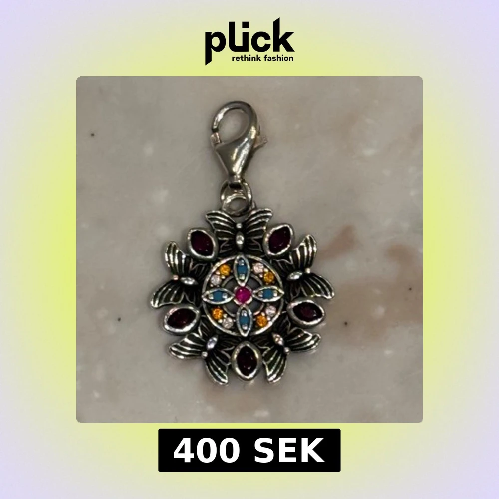 Charm i silver med färgglada stenar i lila, blått och gult. Med fjärilar i en cirkel med massa stenar runtom. Passar bra till ett armband eller halsband! Inte fast pris! Halsbandet säljs inte längre. Halsbandet är i bra skick och har rengjorts i butik nyligen då hängstycket byttes ut.