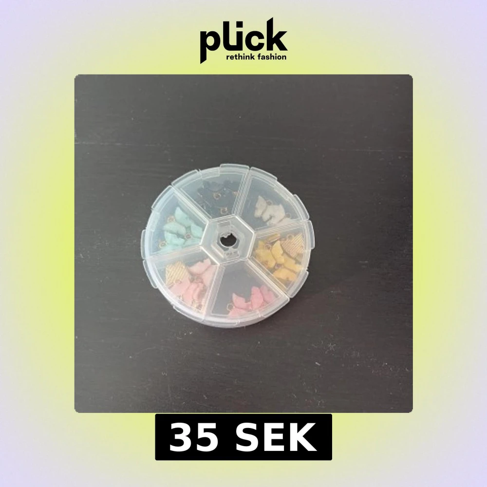 Säljer ett set örhängen med små fjärilar i olika pastellfärger som rosa, blå, gul och vit. Alla örhängen har guldfärgade detaljer och kommer i en praktisk rund förvaringsask. Perfekt för dig som gillar söta accessoarer och vill variera din stil.
