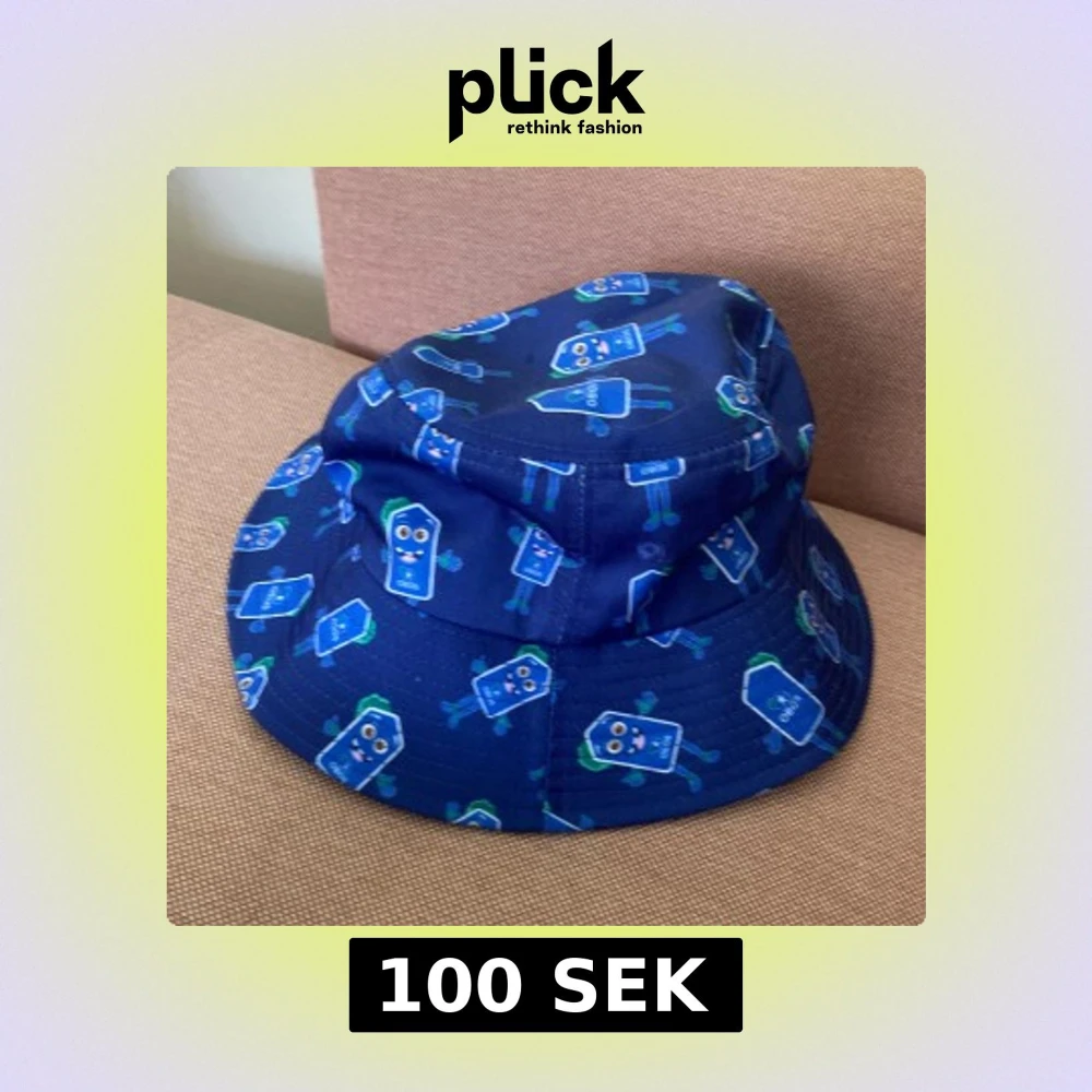 Cool blå bucket hat med ett mönster av tecknade figurer i blått och grönt. Hatten är tillverkad i 100% polyester och har en avslappnad passform. Perfekt accessoar för att sticka ut i mängden.