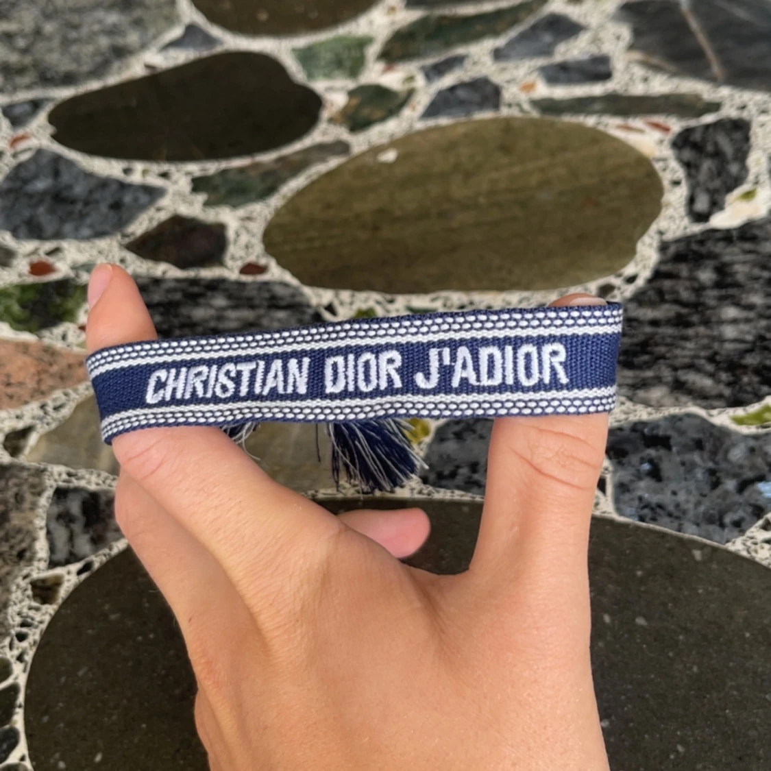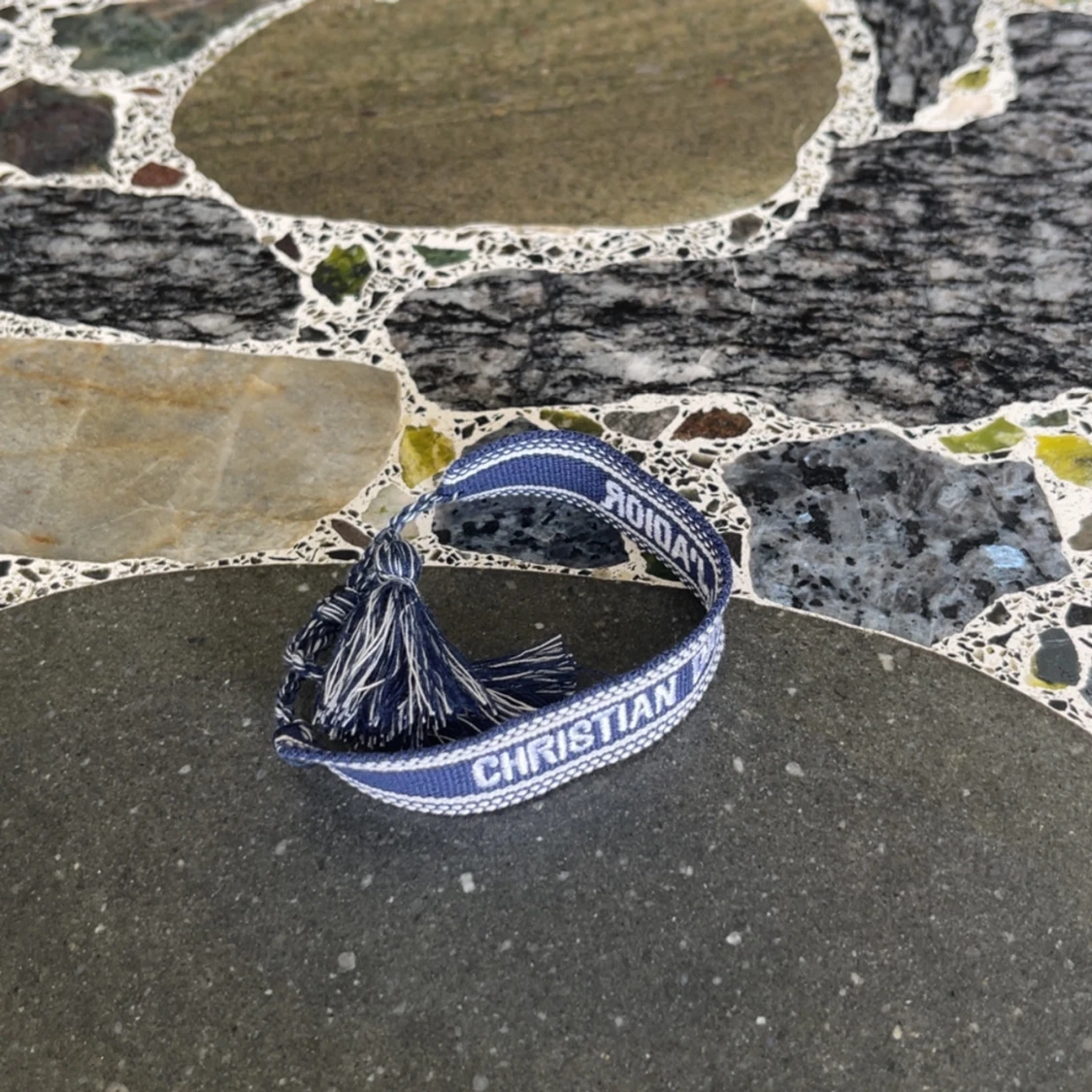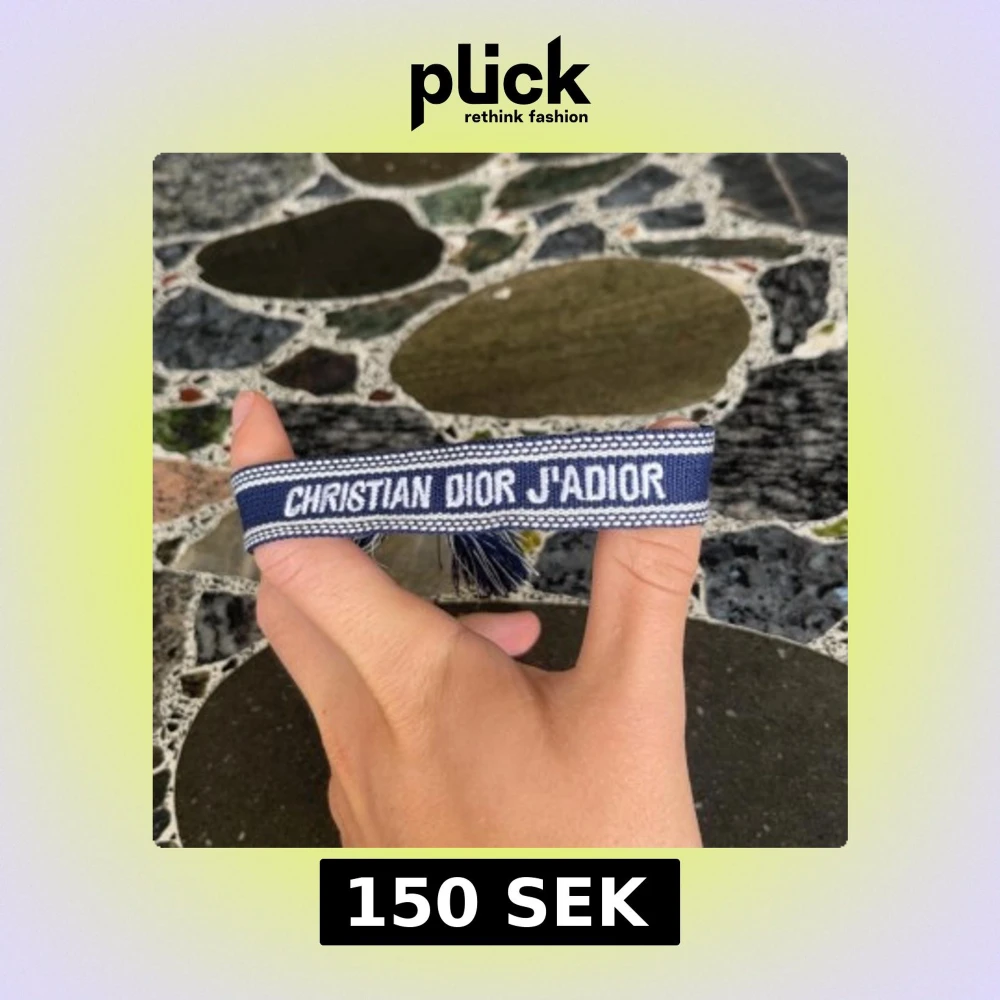 Snyggt blått armband från Christian Dior med texten 'J'Adior' broderad i vitt. Armbandet har en cool boho-vibe med tofsar i ändarna och är gjort i ett mjukt tygmaterial. Perfekt för att ge din outfit en lyxig touch och visa din Dior-kärlek.