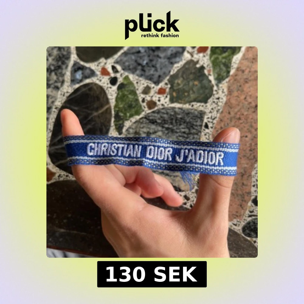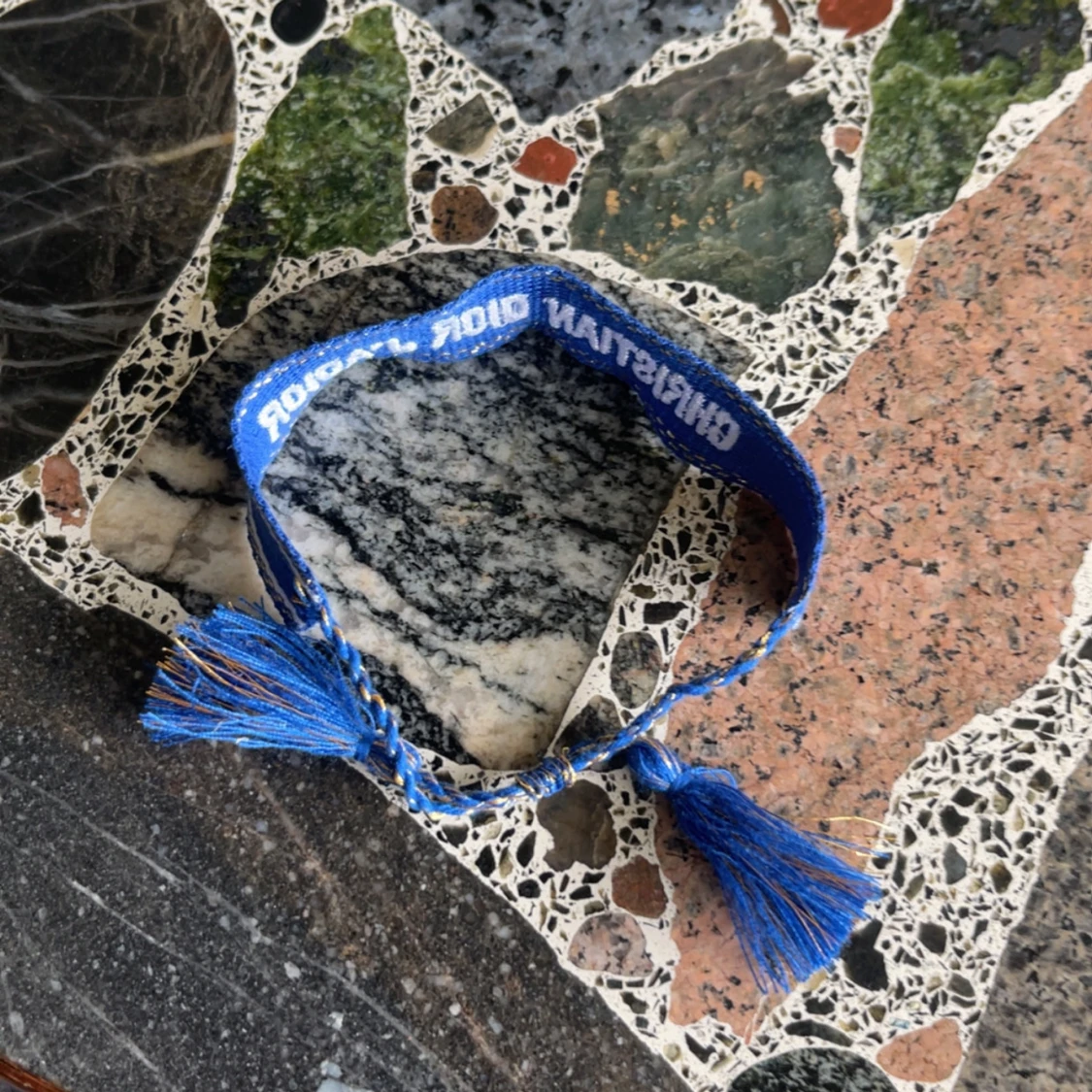 Snyggt blått armband från Christian Dior med texten 'J'Adior' broderad i vitt. Armbandet har dekorativa tofsar i ändarna och detaljer i guld. Perfekt accessoar för att lyfta din outfit med lite lyxig vibe.