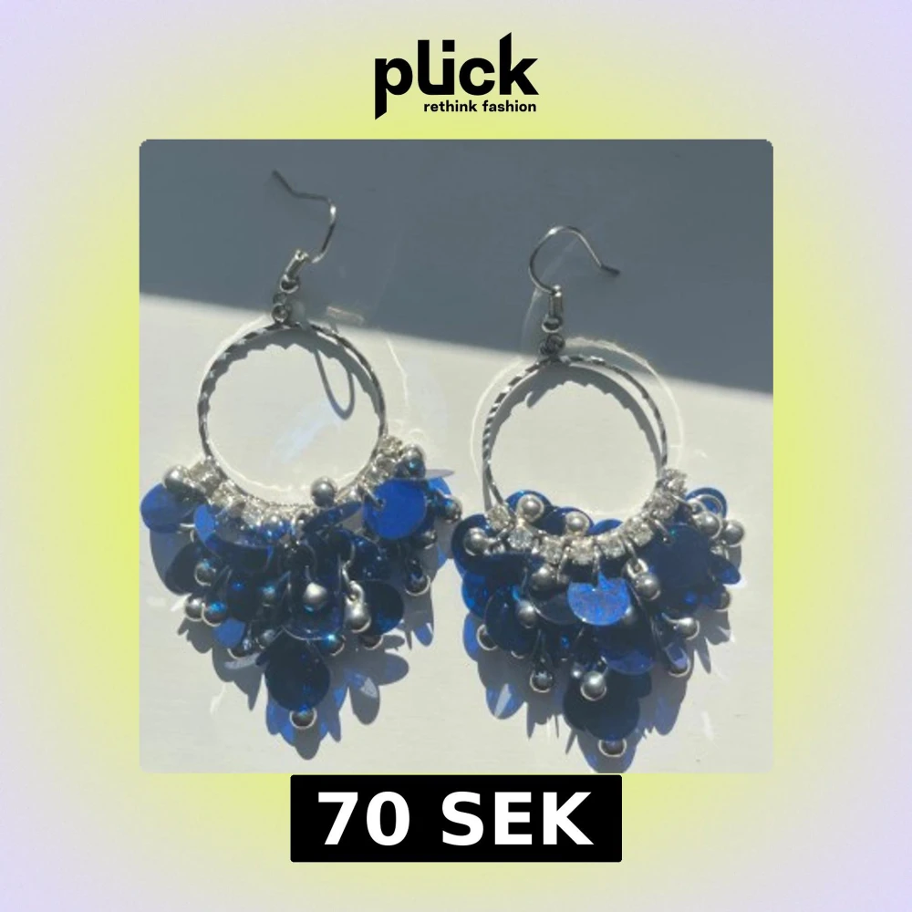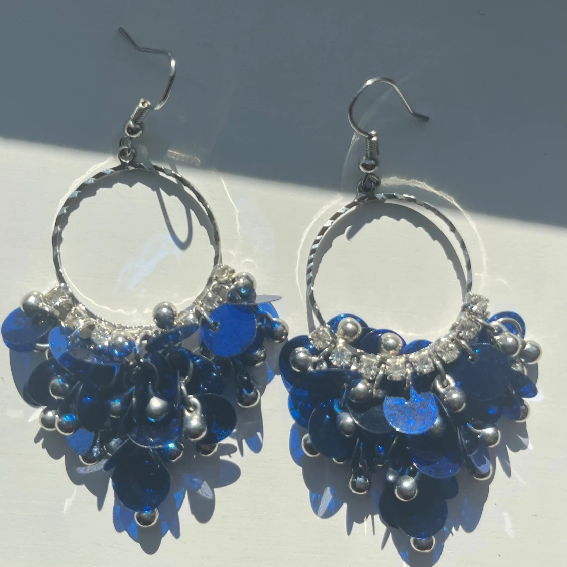 Säljer ett par stora, runda örhängen med blå glittriga paljetter och silvriga pärlor. Örhängena har en metallring med tvinnad design och gnistrande stenar upptill. Perfekta för dig som vill sticka ut och addera färg till din look.