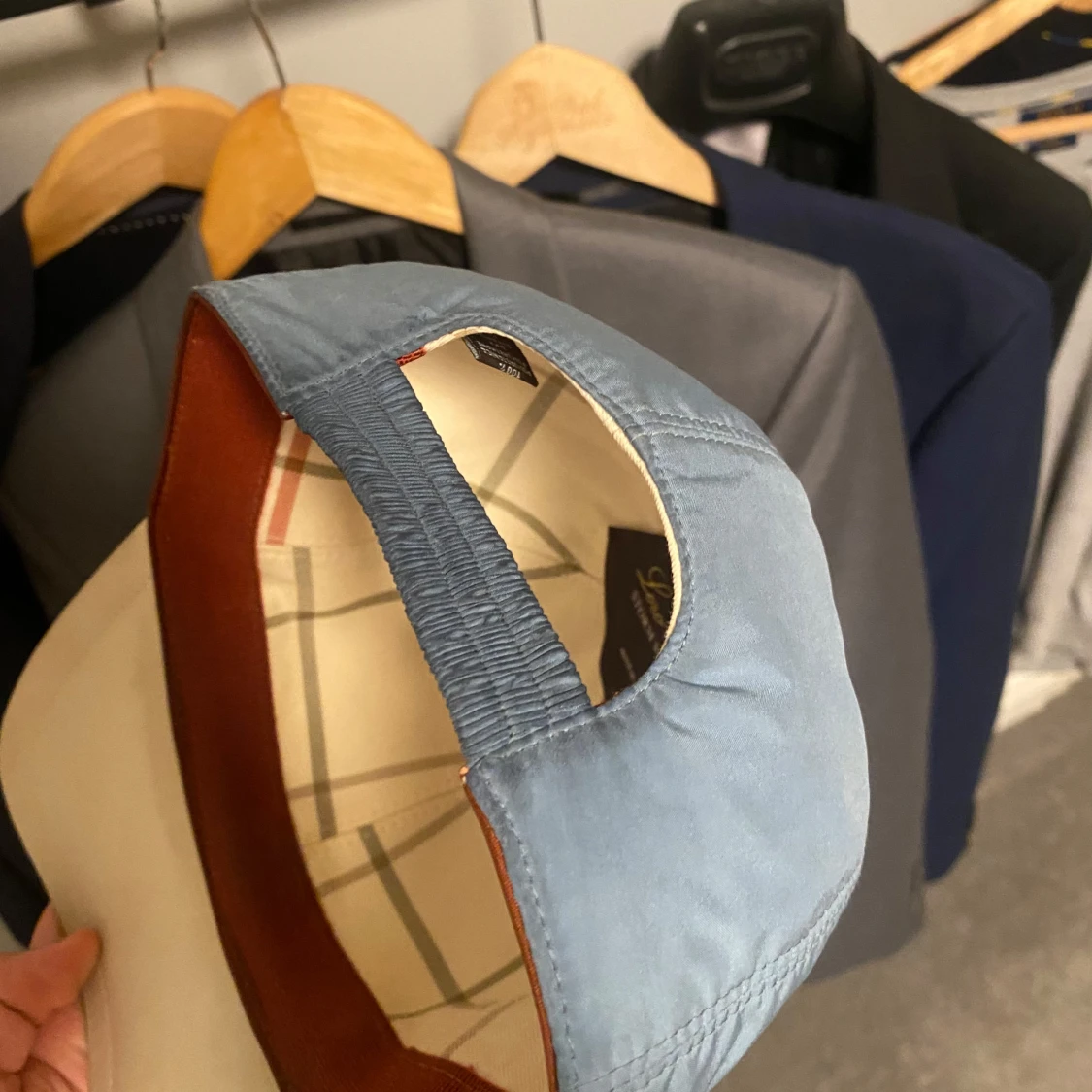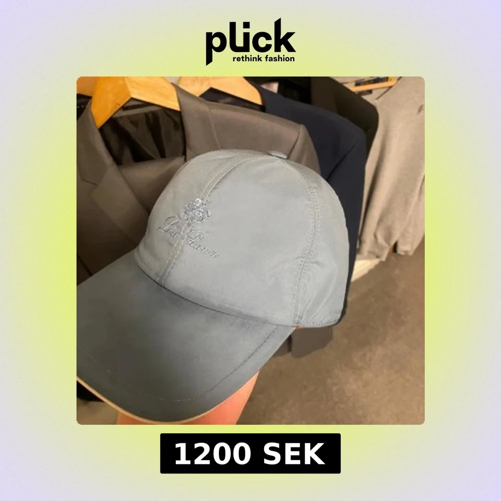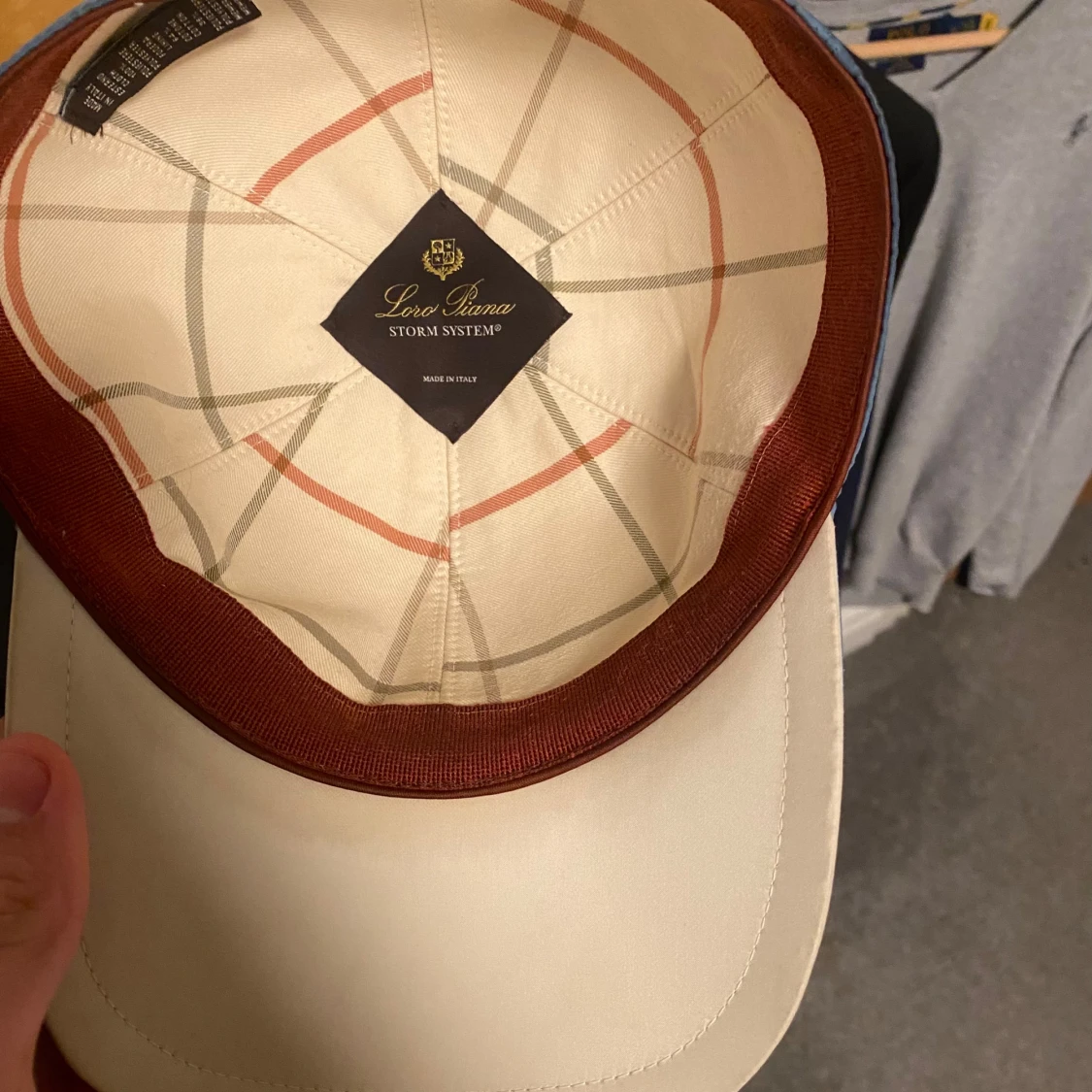 Snygg blå keps från Loro Piana med broderad logotyp framtill. Perfekt för en stilren look. Kepsen har lite fläckar framme vid där skärmen börjar samt under skärmen och ovanför spännet men inget som man tänker på särskilt mycket men därav priset. Vid fler bilder är det bara att fråga!