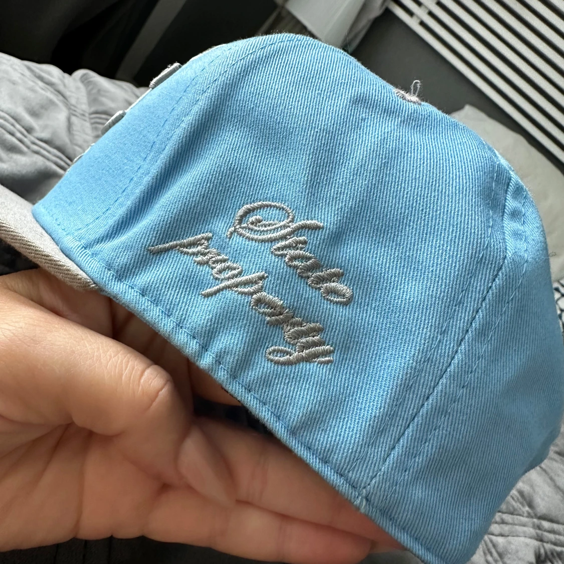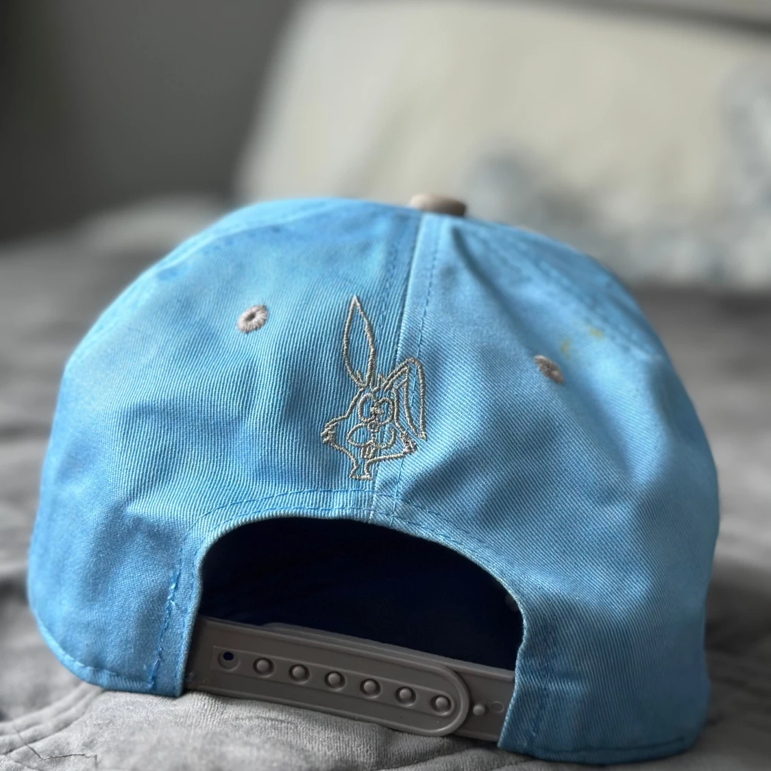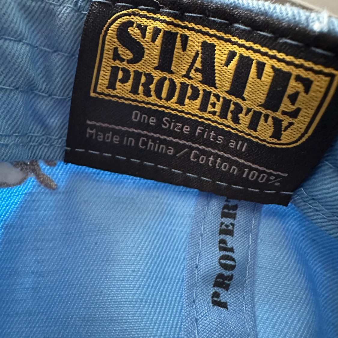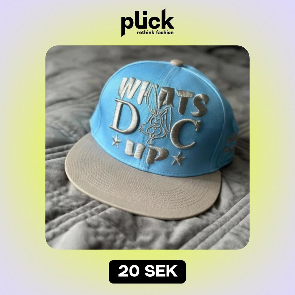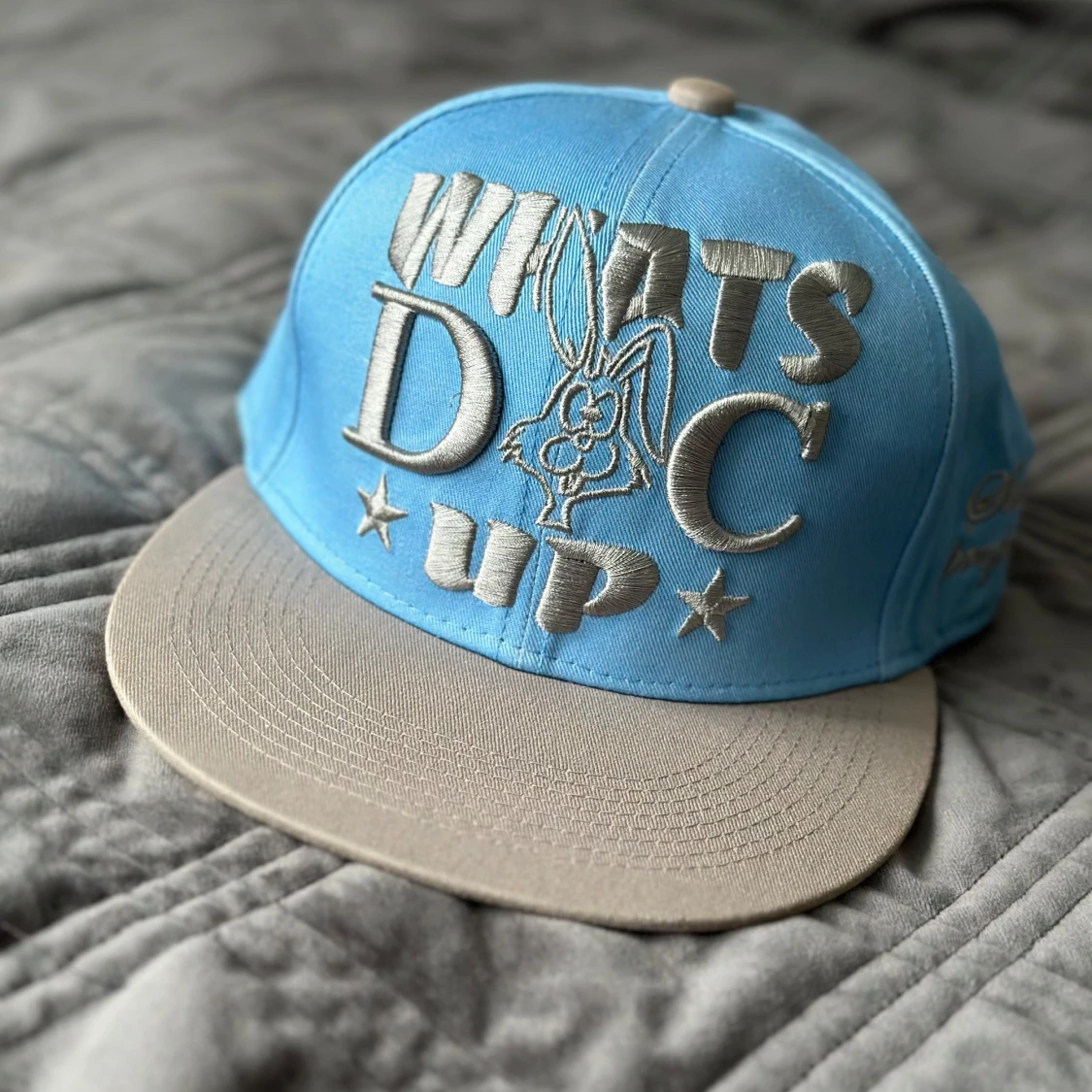 Keps från State Property med texten 'What's Up Doc' och en tecknad kanin broderad på framsidan. Kepsen har en grå skärm och justerbar baksida.