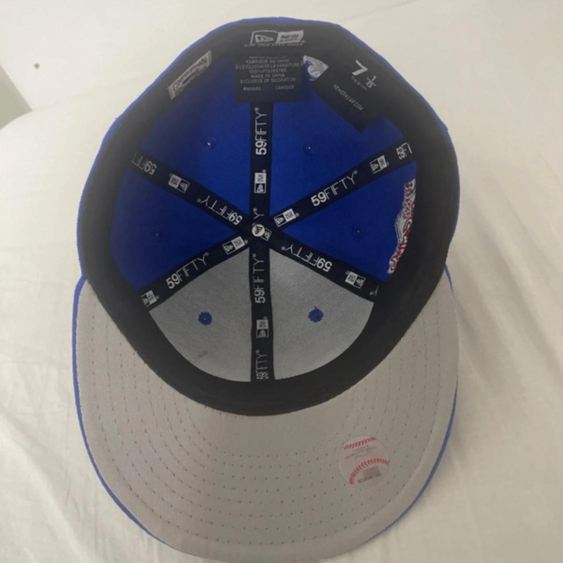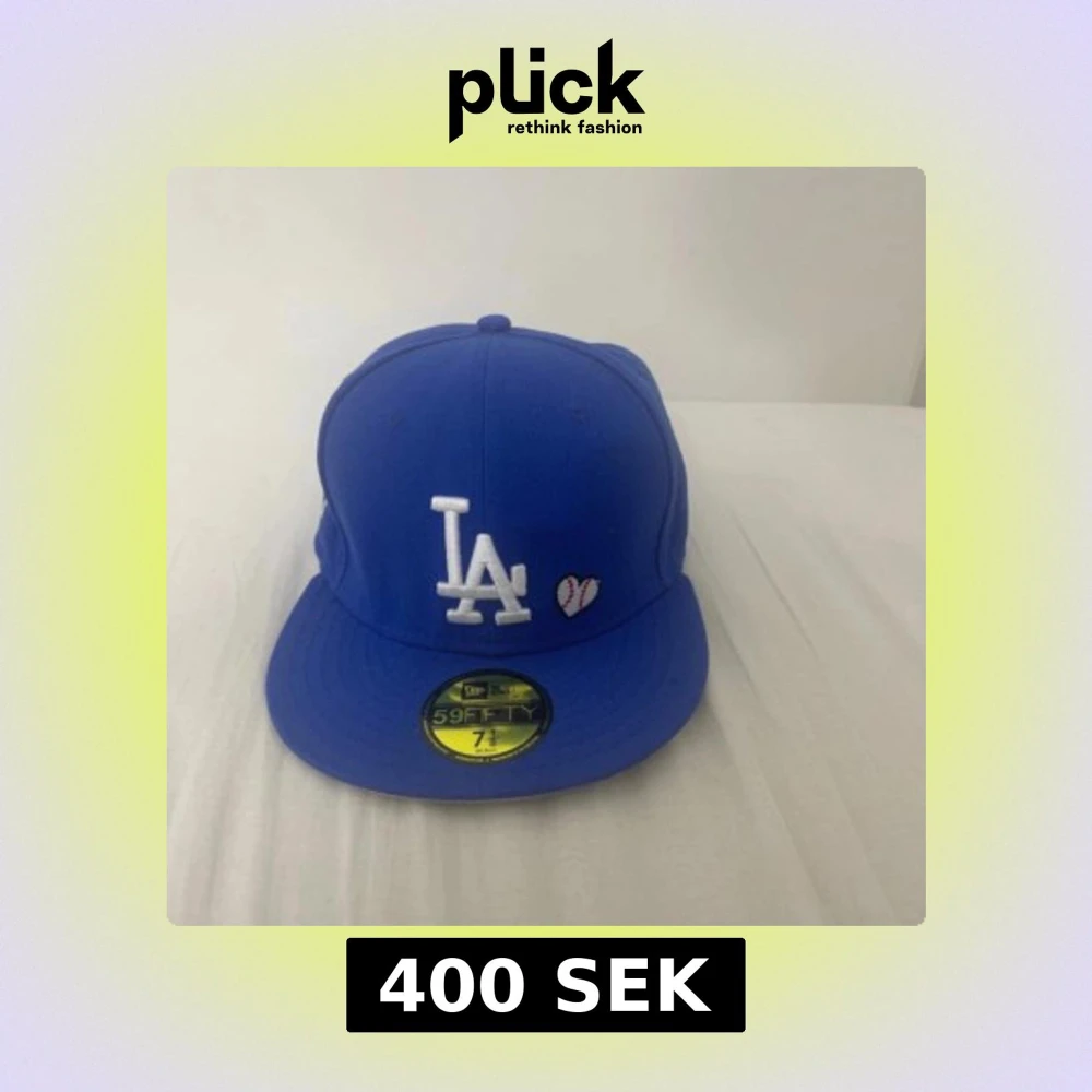 Snygg blå LA Dodgers 59FIFTY keps från New Era med broderad LA-logga framtill, World Series 1988 patch på sidan och texten 'Love & Hustle Game' bak. Klassisk basebollstil med platt skärm och broderade detaljer. Perfekt för dig som gillar sportig streetwear. Anledningen för att jag säljer den är för att den var lite stor