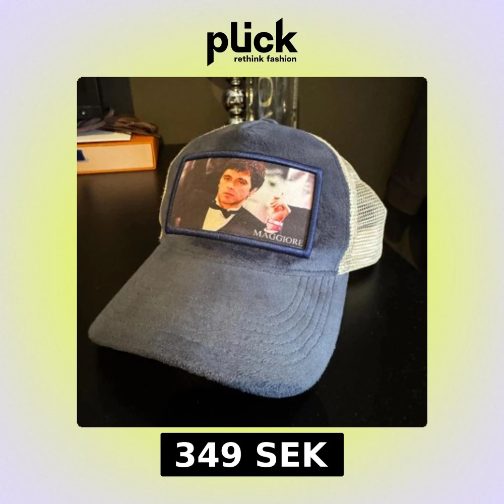 Säljer en blå keps från Maggiore med mesh på sidorna och baksidan. Framtill finns en patch med bild och text. Skärmen är böjd och materialet känns mjukt, troligen polyester. Perfekt för dig som gillar unik streetstyle.
