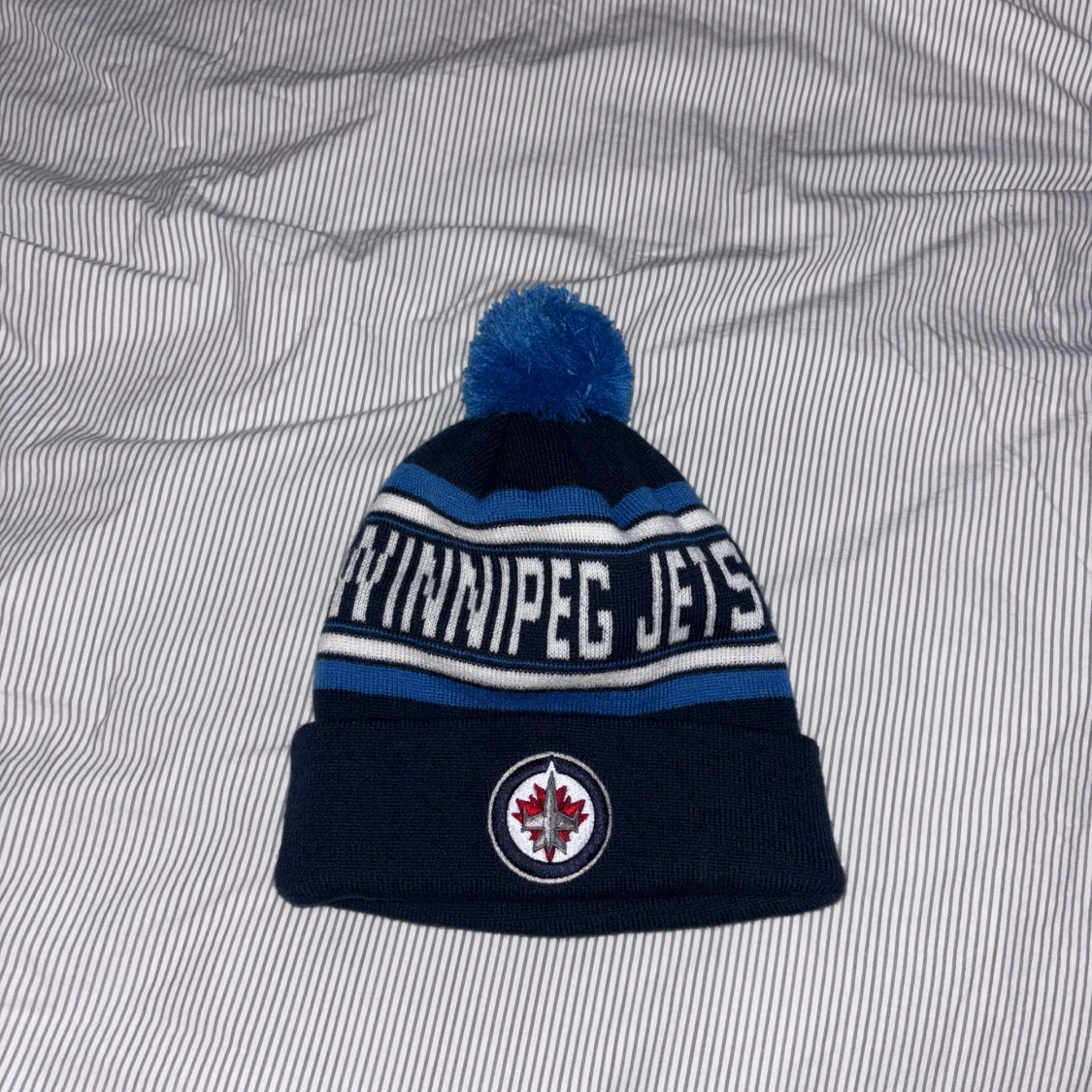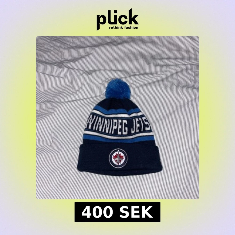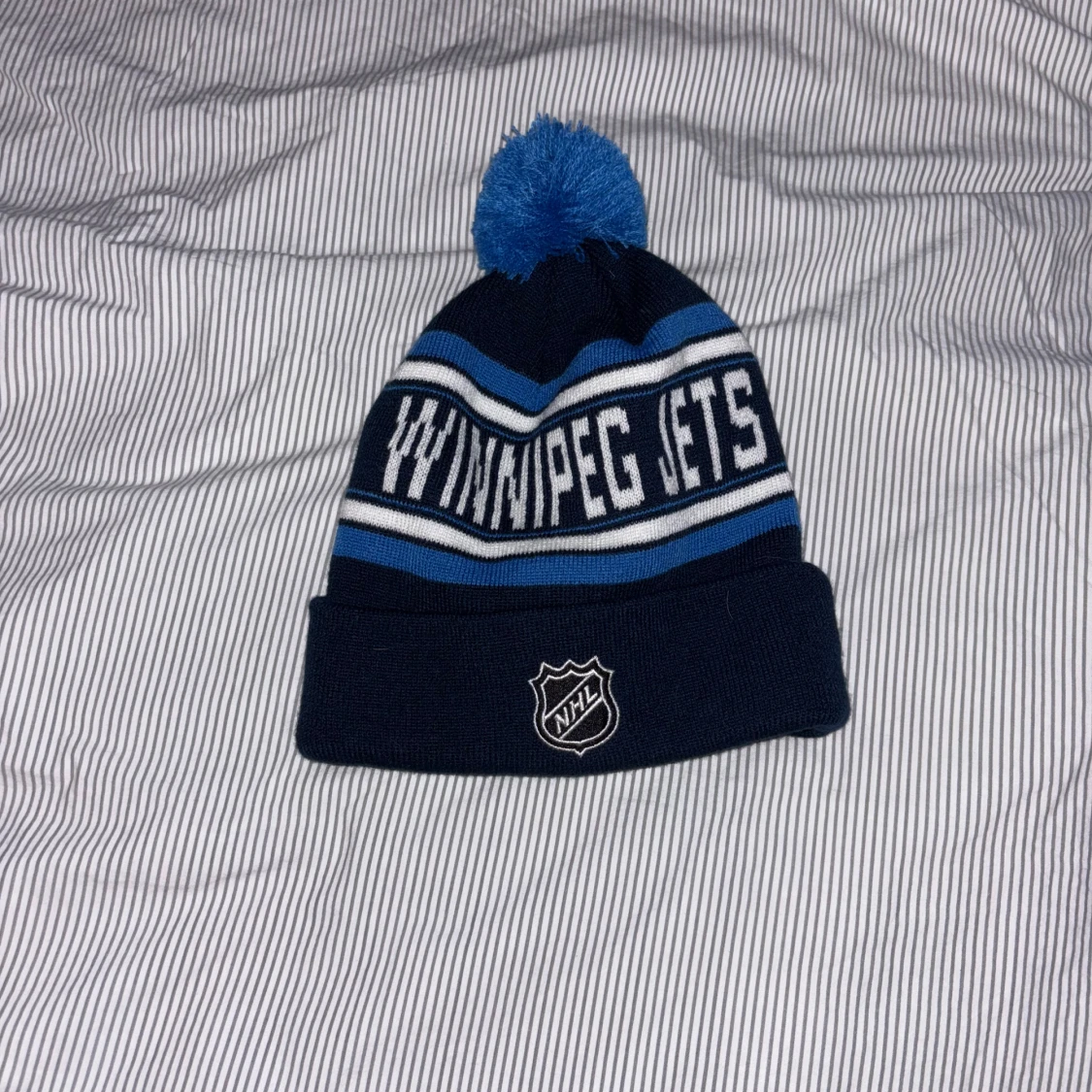 Snygg stickad mössa i mörkblått och ljusblått med vit text 'WINNIPEG JETS' runt om. Mössan har en blå tofs på toppen och broderade loggor fram och bak. Perfekt för dig som vill visa ditt stöd för Winnipeg Jets under kalla dagar. pris diskuterbart