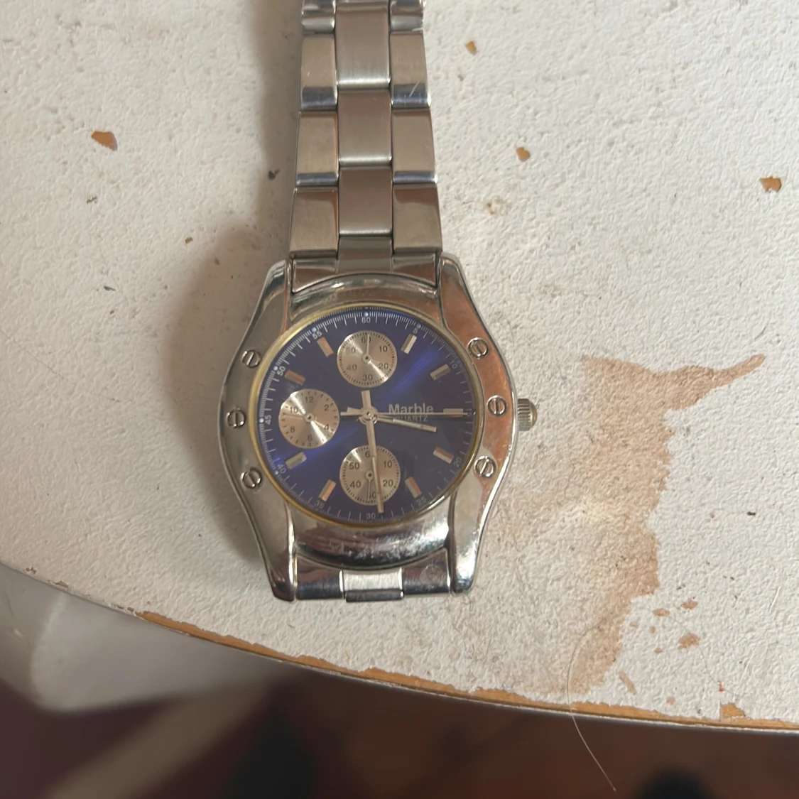 Stilren klocka från Marble med blå urtavla och tre silvriga subdials. Boetten och länken är i blankt silverfärgat metall, vilket ger en klassisk och clean look. Perfekt accessoar för dig som gillar detaljer och snygg design.