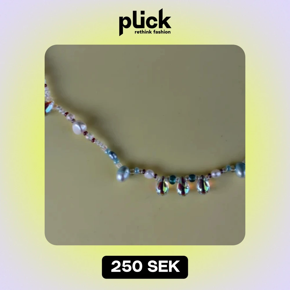 Säljer ett unikt och färgglatt halsband med pärlor i olika nyanser av blått, vitt och rött. Halsbandet har skimrande droppformade detaljer som ger en extra touch av glamour. Perfekt för att liva upp vilken outfit som helst!