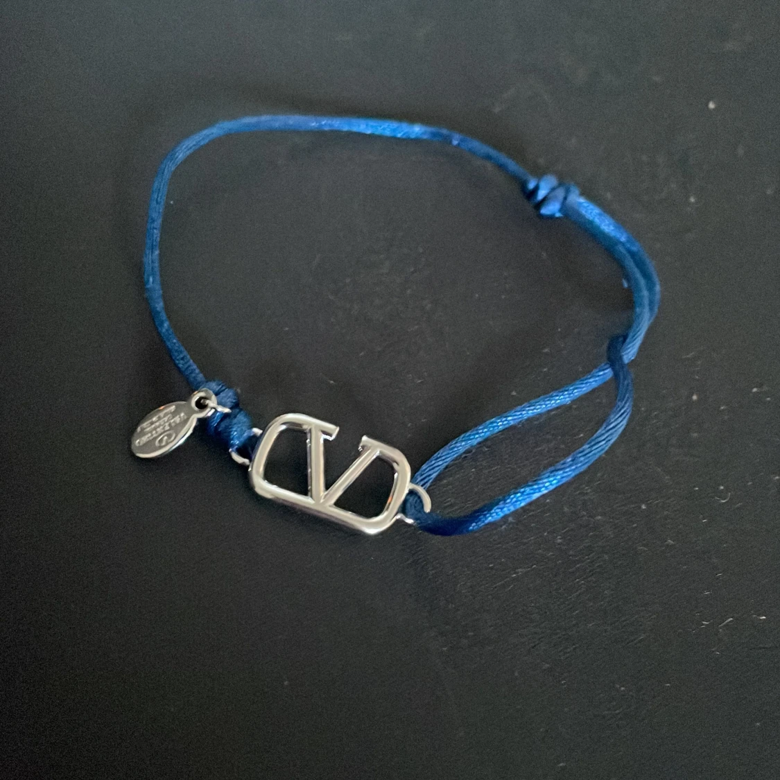 Snyggt armband från Valentino med blå justerbar tråd och en silverfärgad logodetalj i metall. Perfekt accessoar för att ge din outfit en lyxig touch. Liten bricka med Valentino-gravyr hänger bredvid logon.